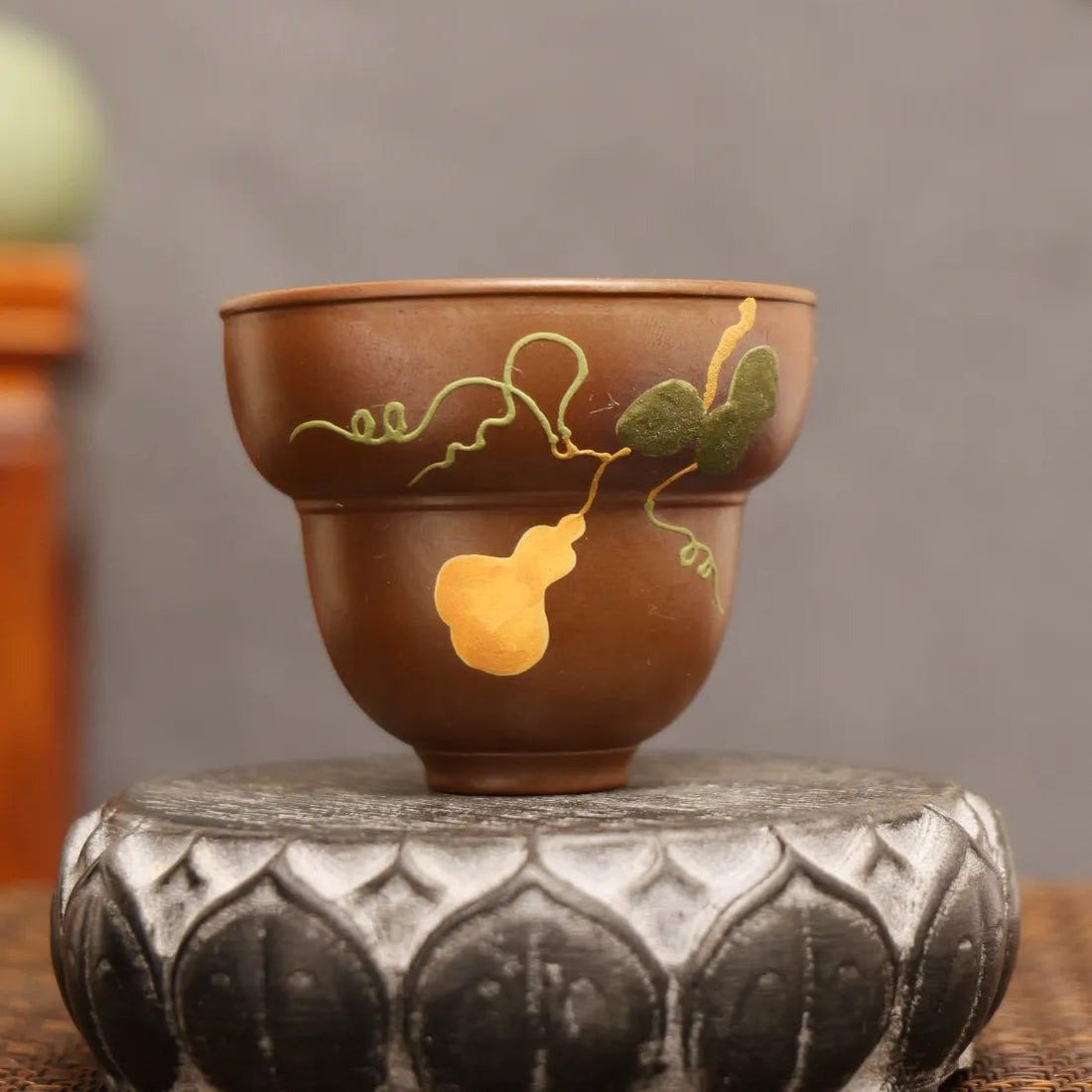 Golden Harvest: Yixing Zisha Teacup with Gourd Vine Motif