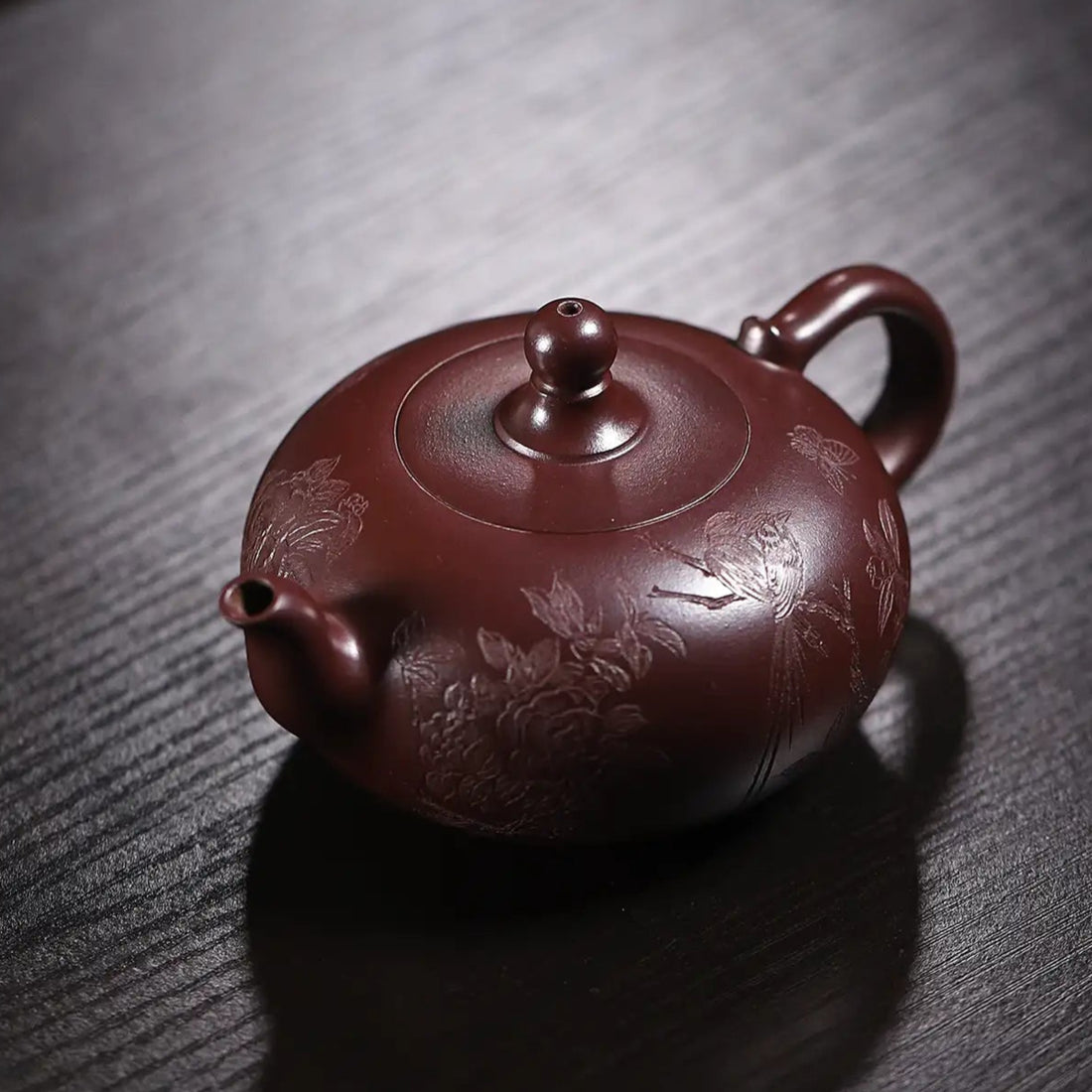 Floral Engraving Fully Handmade Dragon Blood Sand-Zini Clay 'Phoenix Pearl' Yixing Teapot