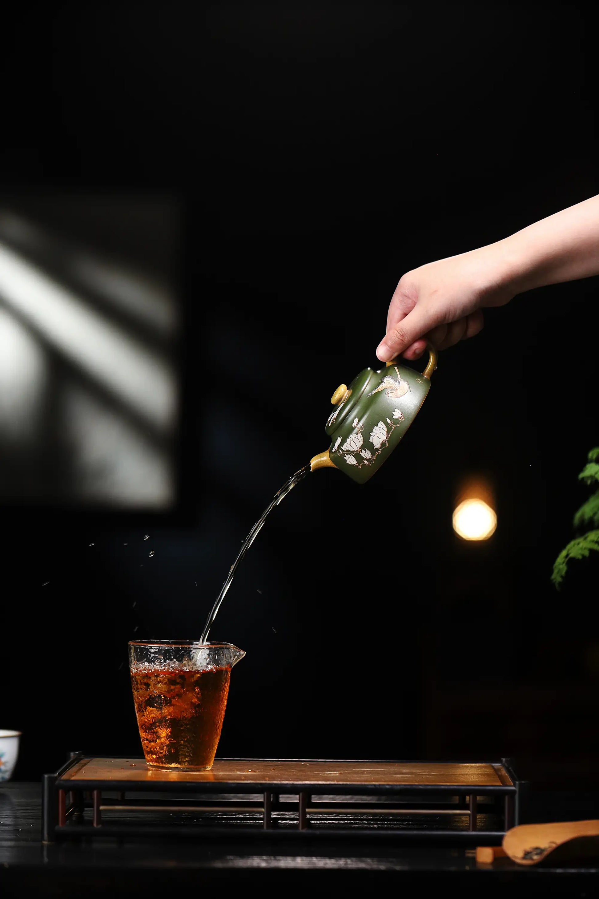 Crafted from authentic Yixing Duan Clay, this teapot is entirely handmade and finished with a powder-decoration technique. The clay exhibits a natural, rustic hue with exquisite texture. A master artisan has employed exquisite painting techniques to depict auspicious birds and orchids, and carved the poetic inscription "Eternal Leisure in Peaceful Times" on the 175ml pot body.