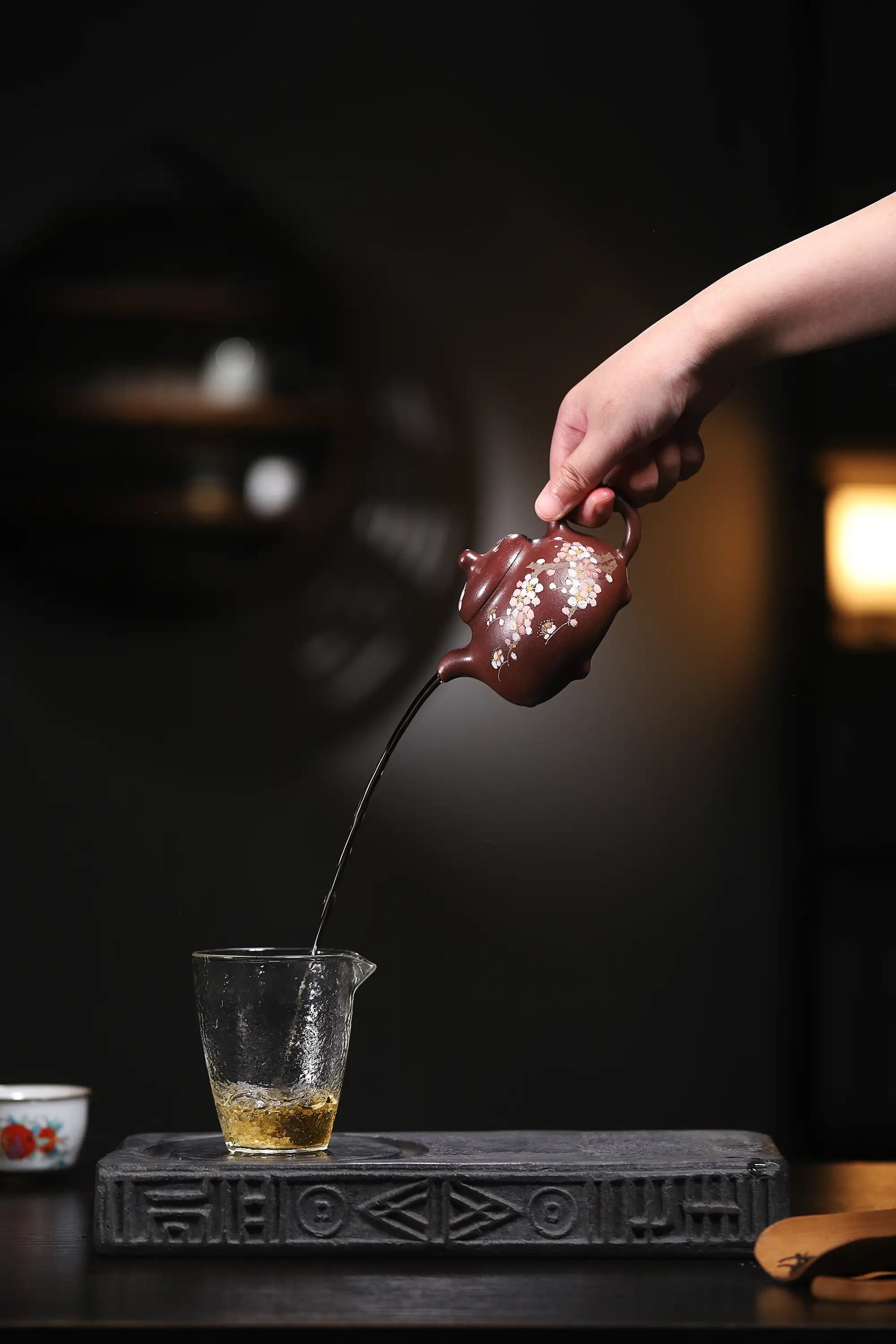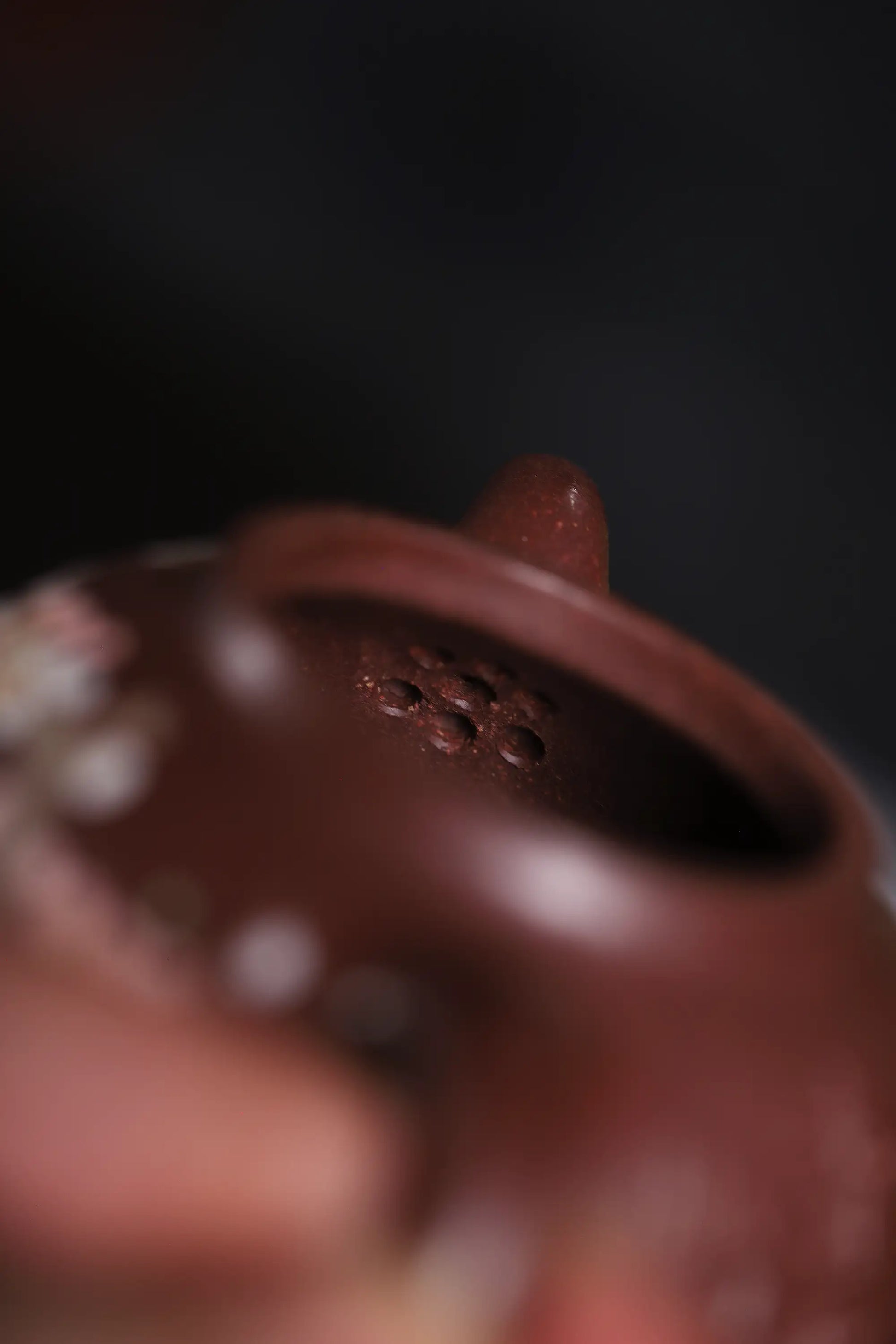 Crafted from rare Yixing Red Bean Sand-Purple Clay, this teapot is entirely handmade. The clay exhibits a warm, rustic hue with natural iron particles, creating a unique texture. A master artisan has employed exquisite clay-painting techniques to depict cherry blossom patterns and engraved the characters "Qing Xiang Yi Ren" (Fragrant and Pleasant).