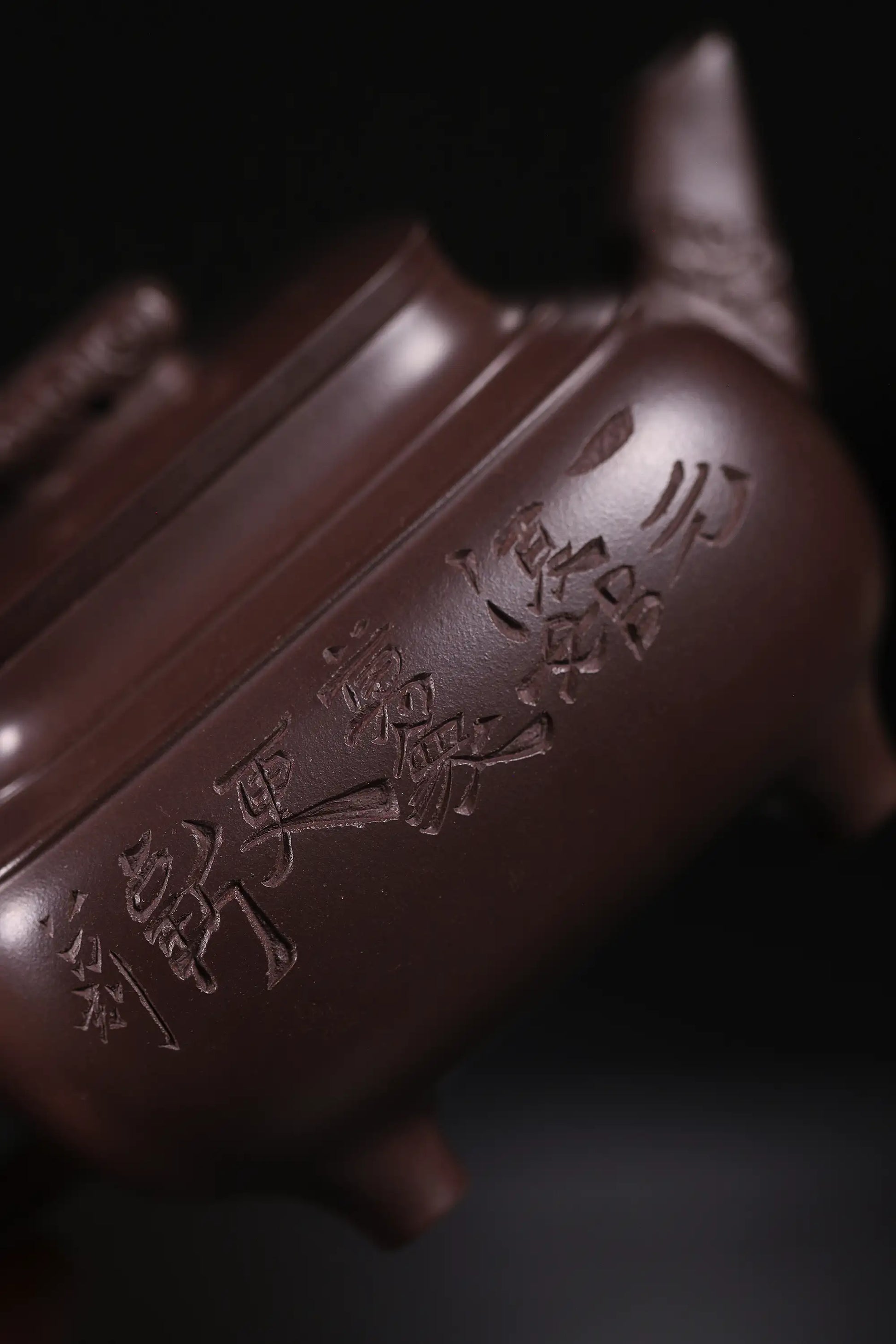 Elephant Carving & Inscription Fully Handmade Aged Purple Clay 'Four-legged Square Chuan Lu' Yixing Teapot