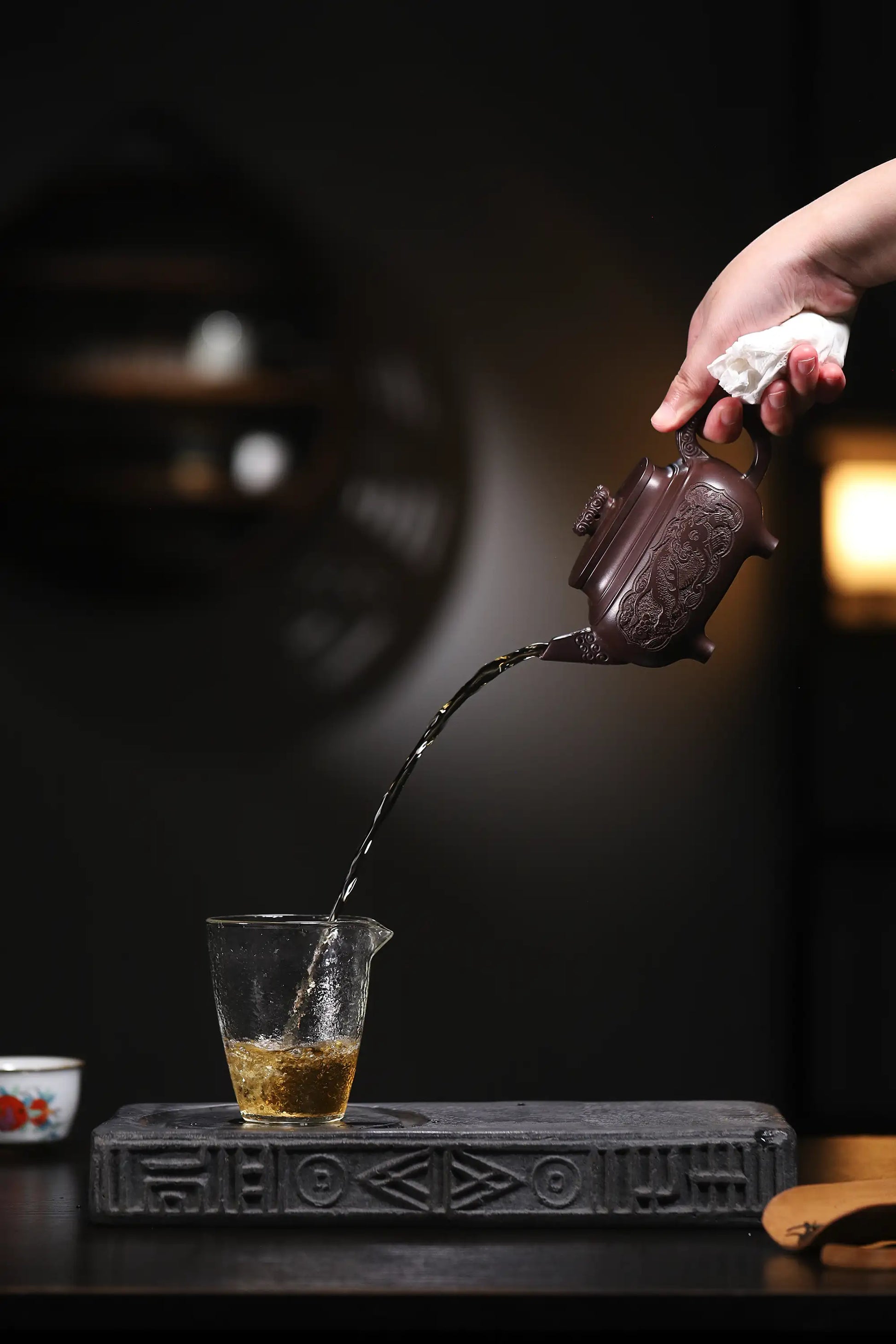 The teapot features the classic Four-legged Square 'Chuan Lu' shape with an upright, majestic silhouette. The four legs provide stable support, while the square ribs flow gracefully from top to bottom. The short spout ensures a powerful pour, while the circular handle offers a comfortable grip. The lid fits perfectly with excellent sealing.