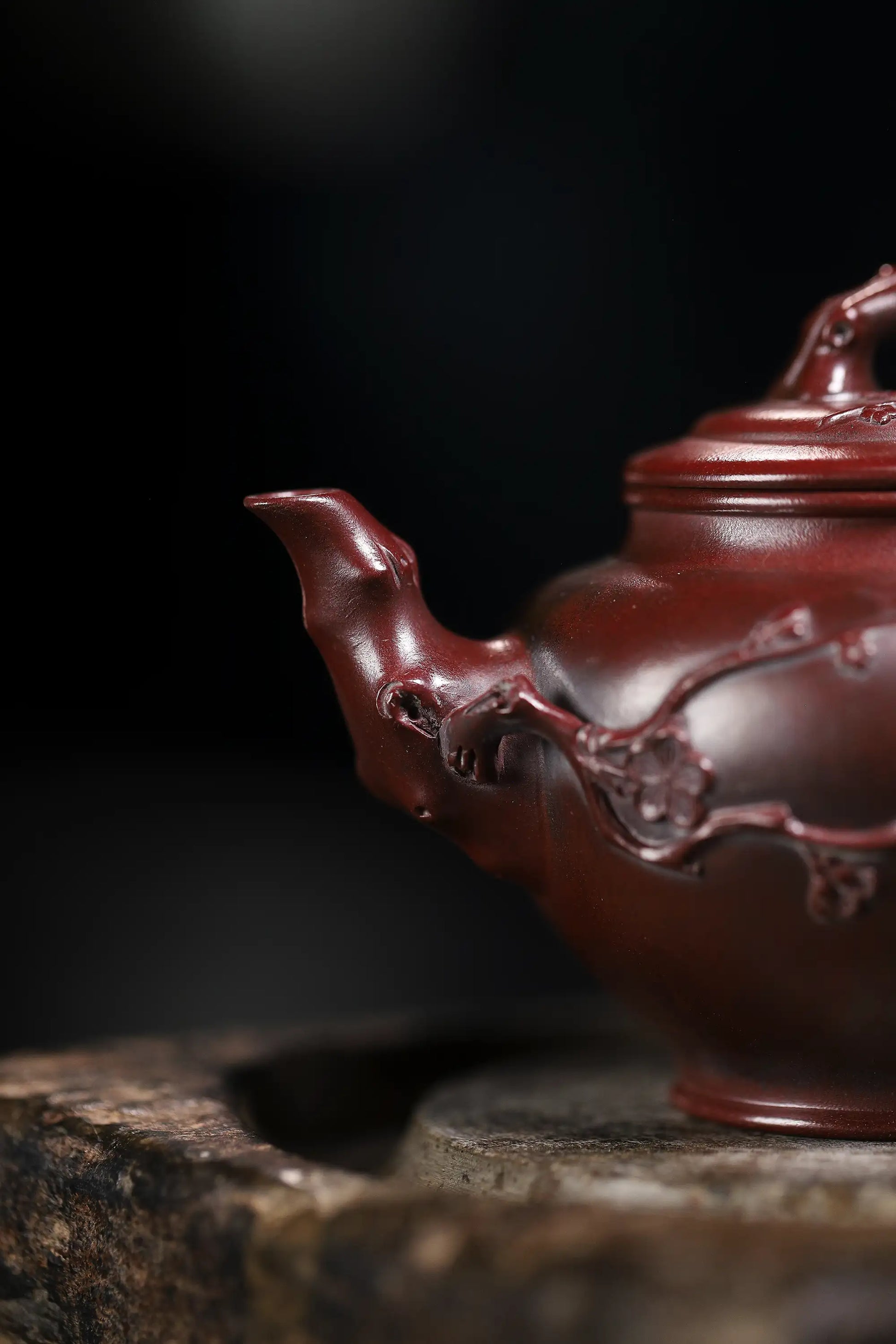 The teapot features the classic 'Plum Herald Spring' shape with an elegant, upright silhouette and gracefully curved lines. The plum-branch spout and handle are lifelike, while the bud-shaped knob complements the overall design perfectly. The lid fits with excellent sealing, demonstrating superb craftsmanship.