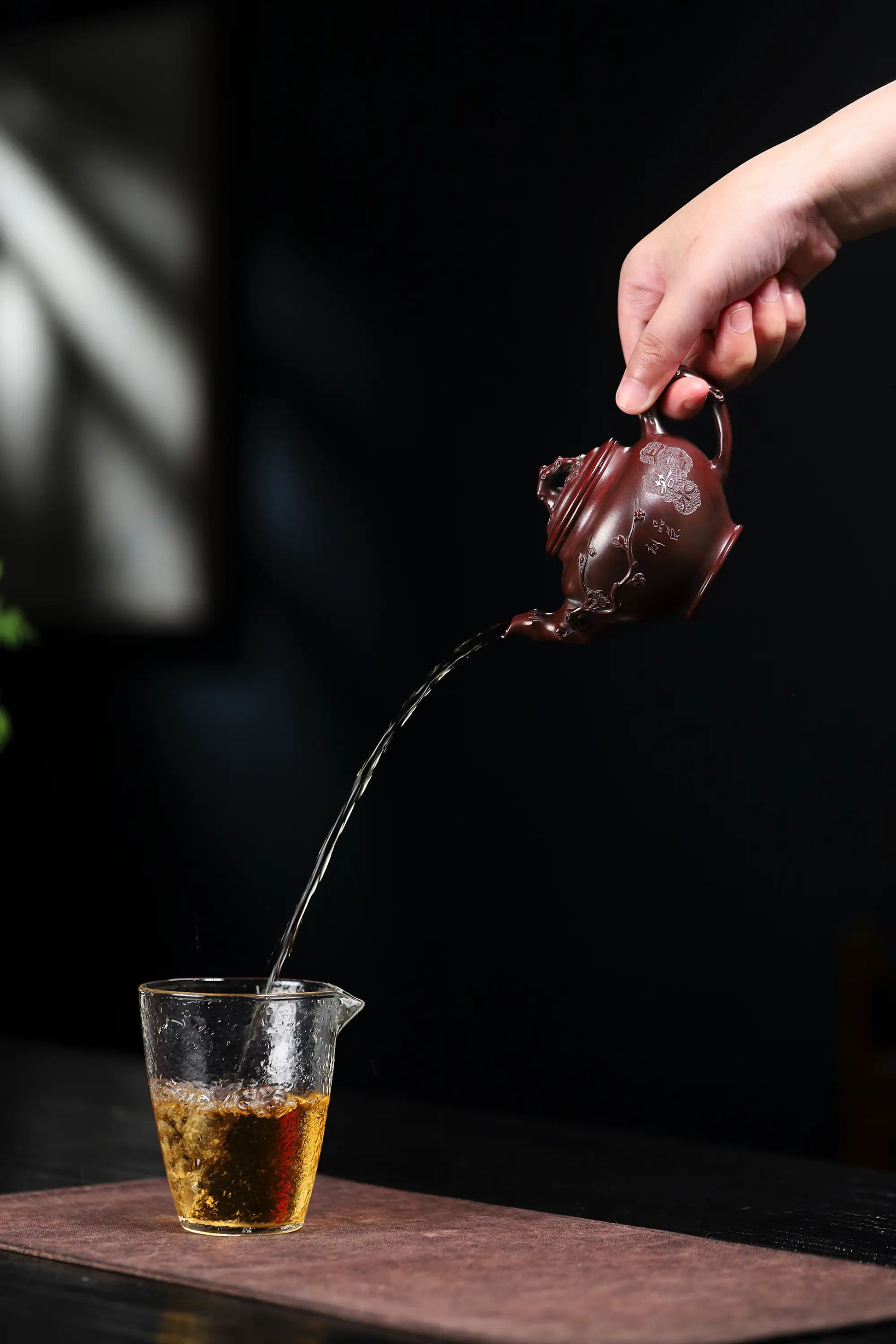 Brew your preferred tea in the pot and pour the tea liquor over the exterior. When the temperature is high, the subtle pores of the teapot expand slightly, allowing moisture to appear on the surface. Gently wipe the body with a tea maintenance cloth while it is still warm. Repeat this entire process at least three times. Note: The tea brewed during this step is not suitable for drinking.
