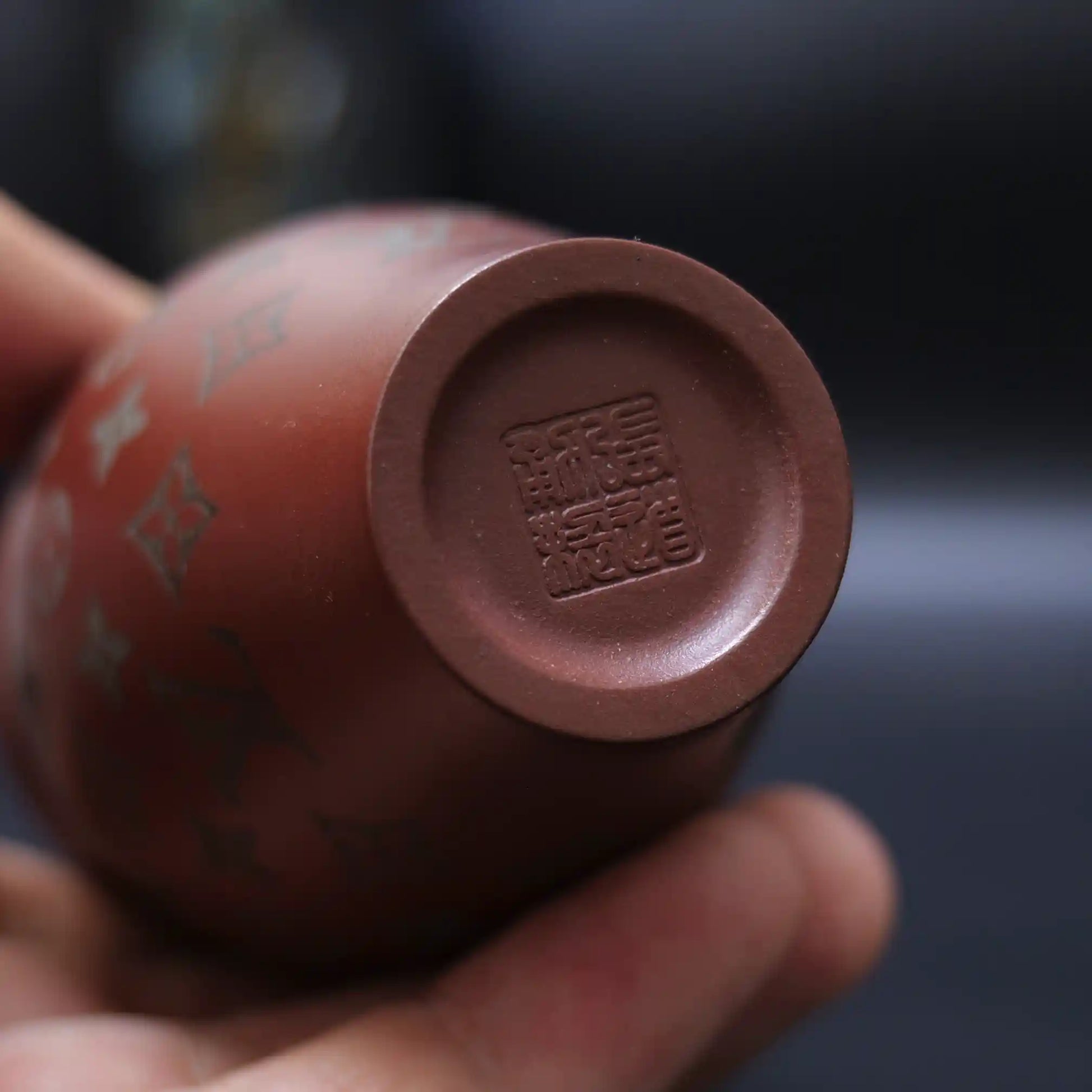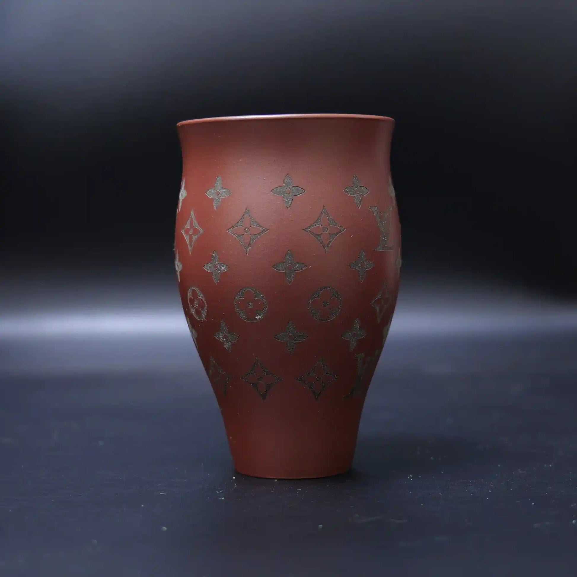 Handcrafted from original Yixing Huanglong Mountain Zisha clay, measuring approximately 8cm (H) × 7cm (Ø). The mineral-rich clay is traditionally kiln-fired at 1260°C to achieve an elegant reddish-brown hue. Features precise pad-printed LV classic monogram patterns (quatrefoil, LV letters, butterfly motifs) with sharp edges, creating a luxurious contrast between metallic accents and Zisha texture.