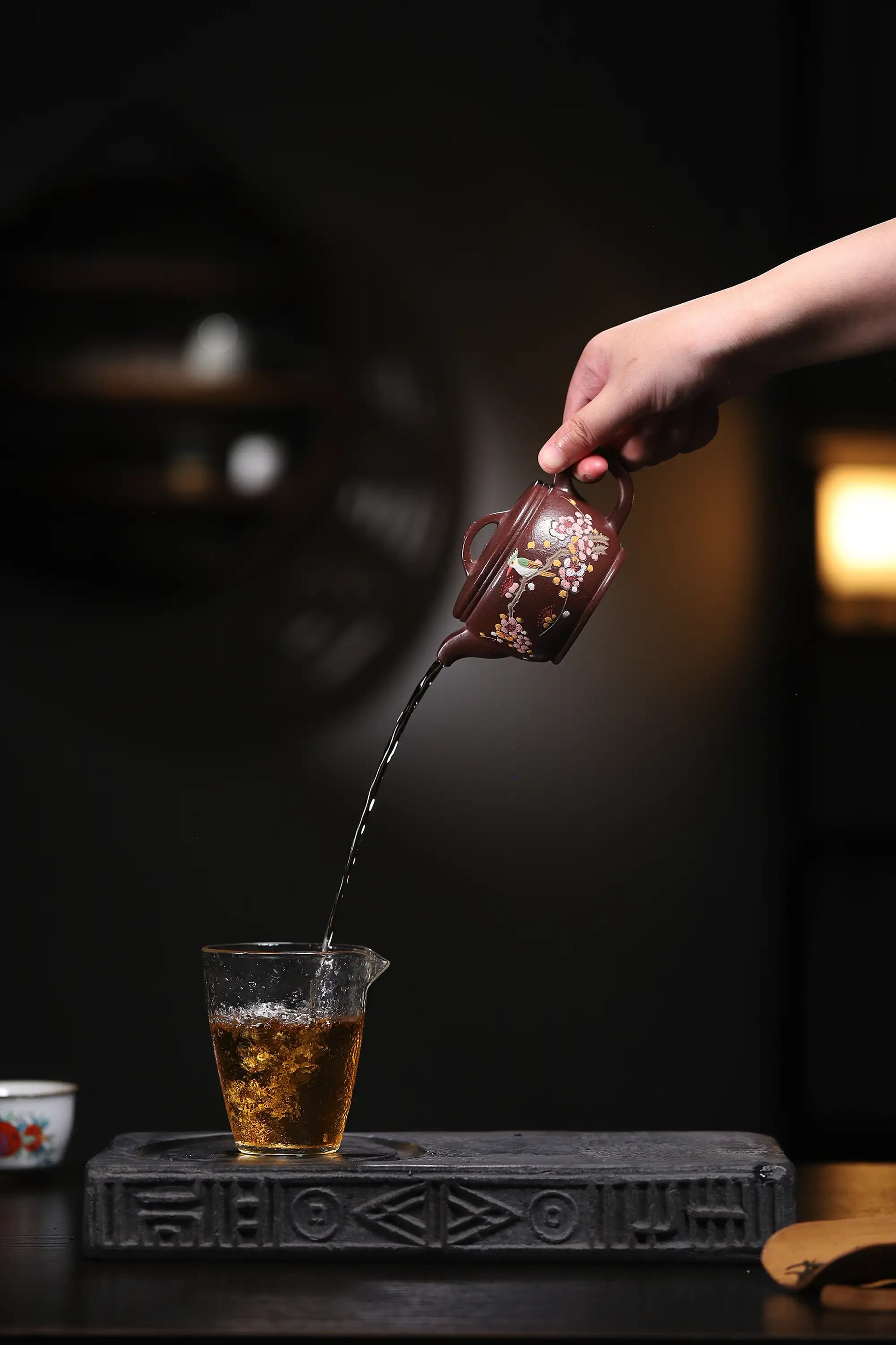 Crafted from rare Yixing Dragon Blood Sand-Purple Clay, this teapot is entirely handmade. The clay exhibits a deep, rustic hue with natural metallic particles, creating a unique texture. A master artisan has employed exquisite clay-painting techniques to depict magpies on plum blossoms on the 200ml pot body, with lifelike details and refined craftsmanship.