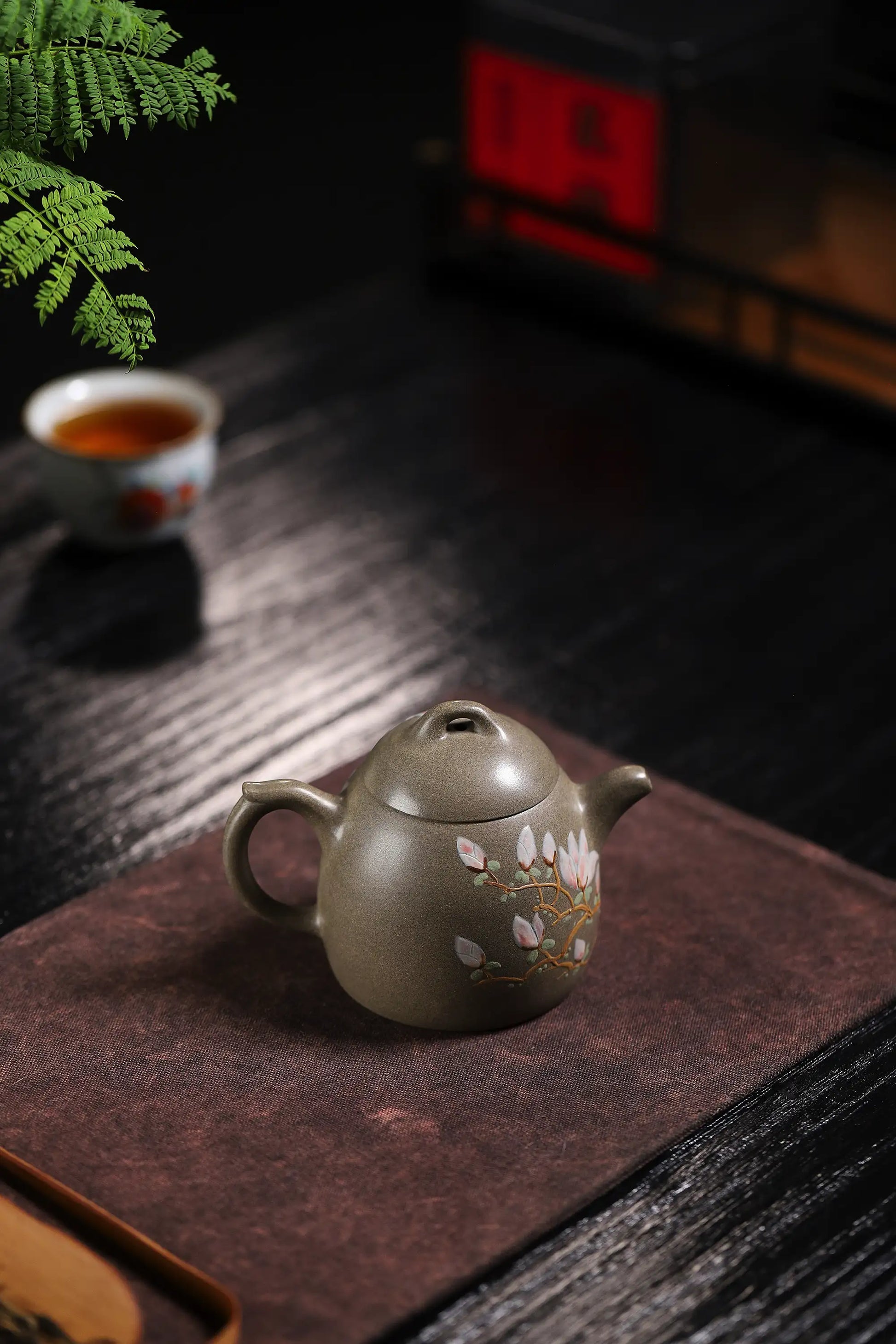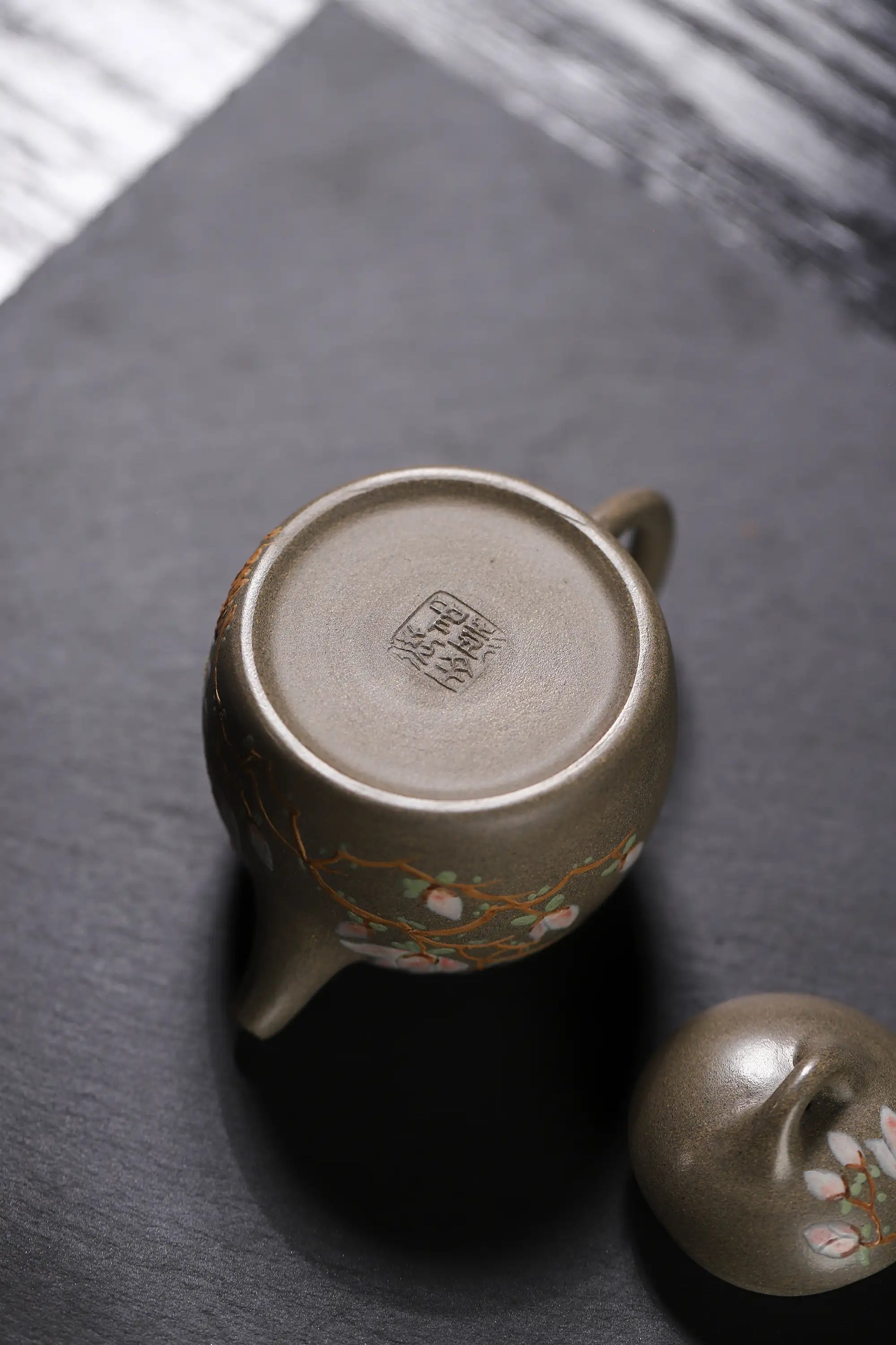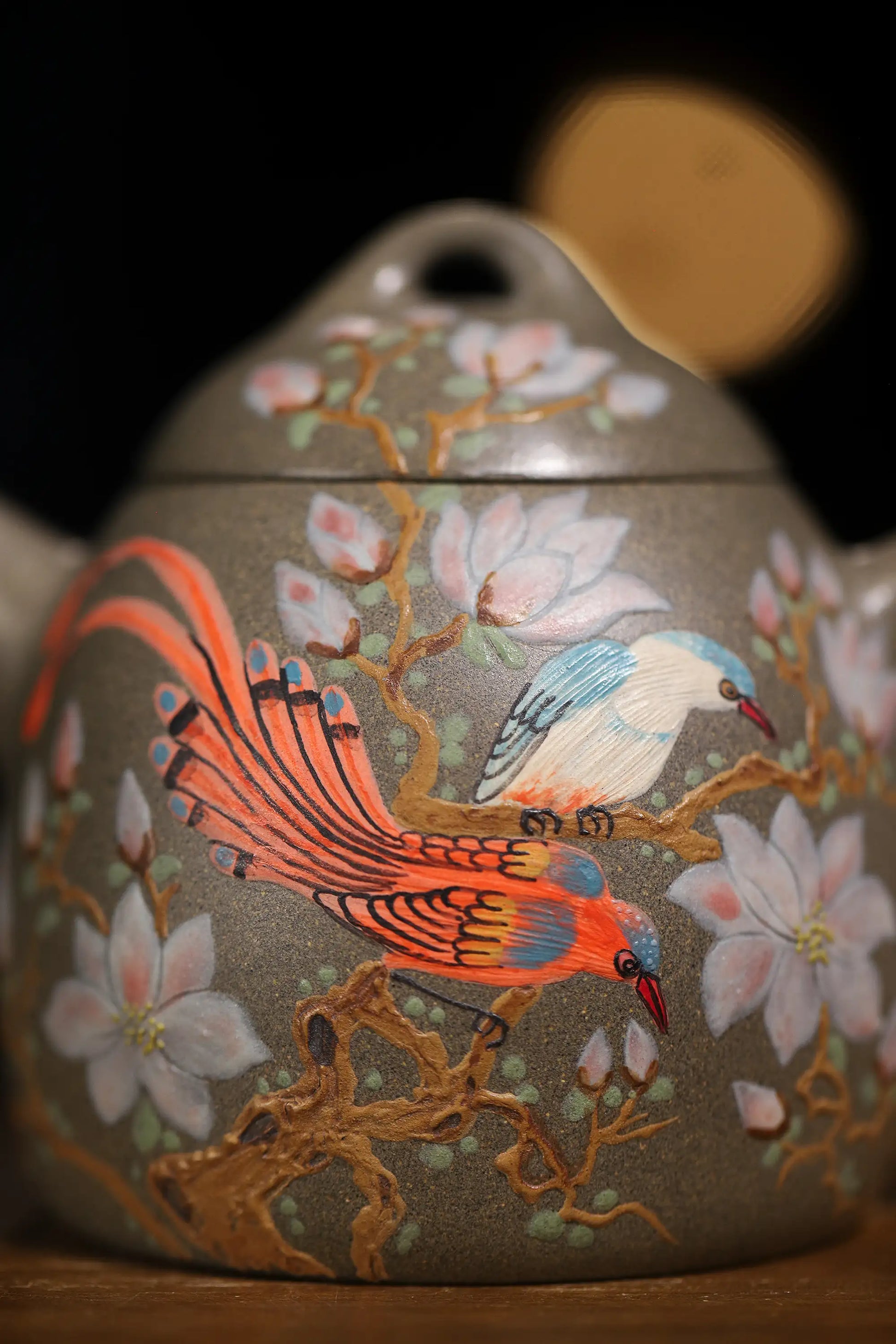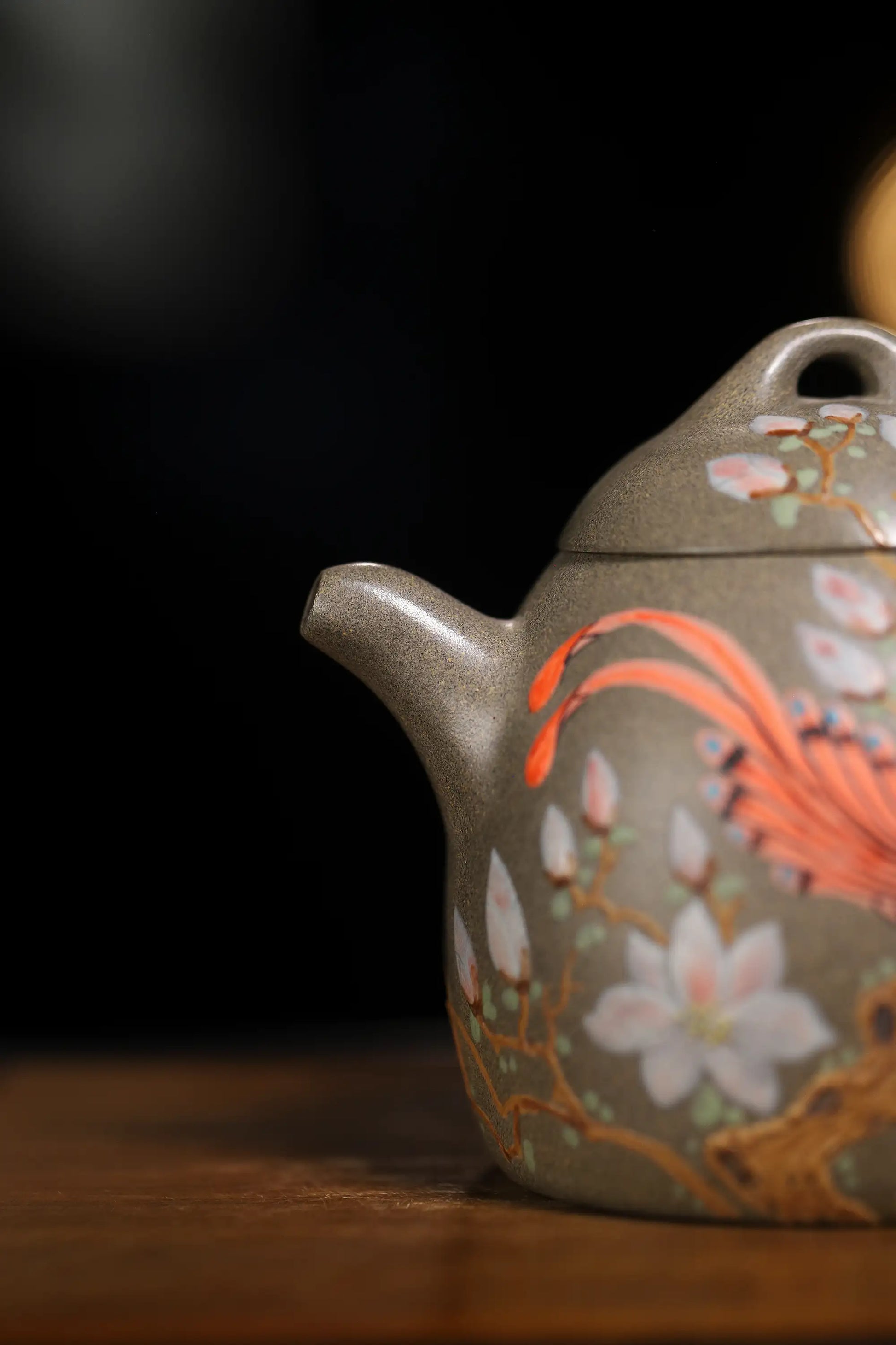 Crafted from rare Yixing Sharkskin Green Clay, this teapot is entirely handmade. The clay exhibits a grayish-green hue with natural sharkskin texture, creating a unique feel. A master artisan has employed exquisite clay-painting techniques to depict the "Magpie on Plum Branch" pattern on the 275ml pot body, with lifelike details and vibrant colors.