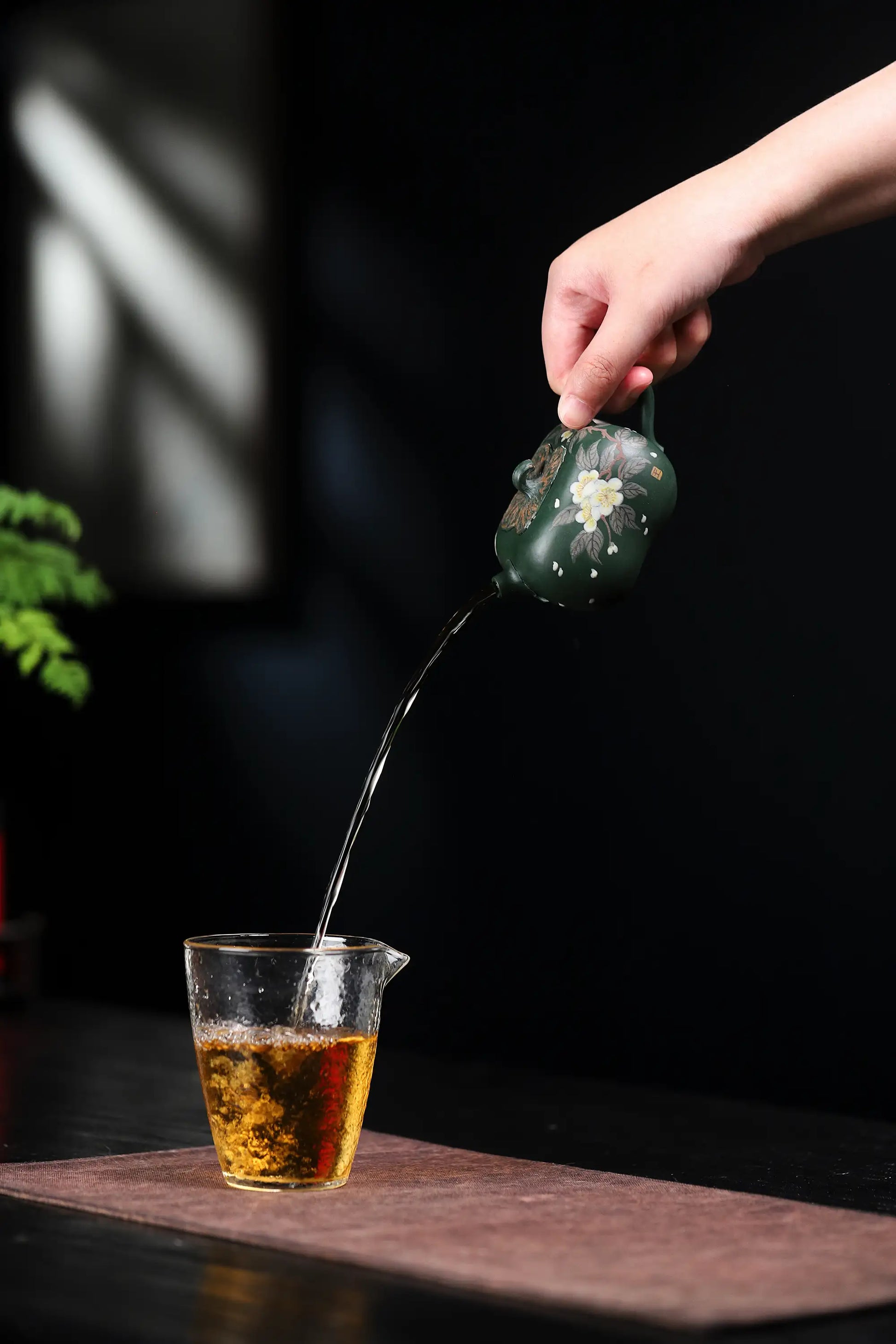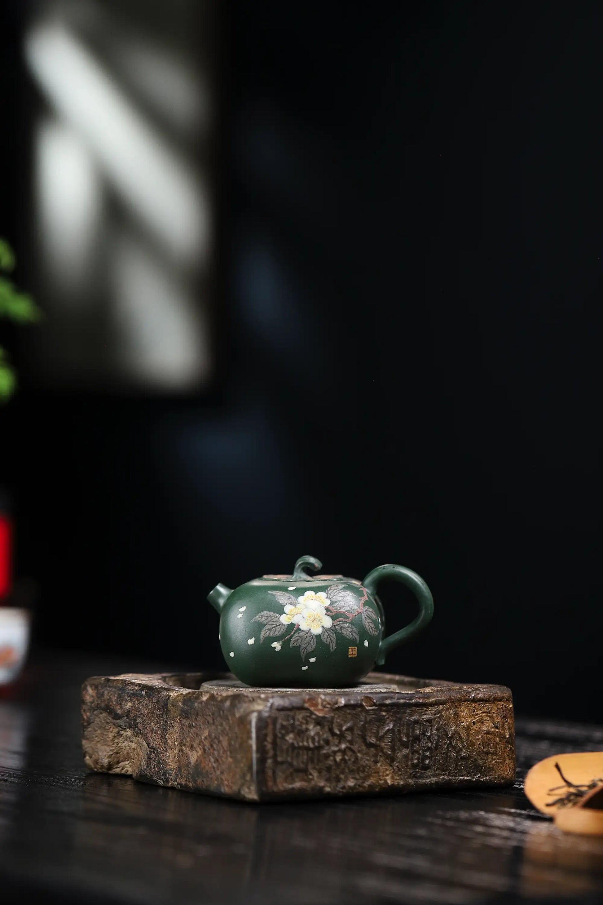 Crafted from aged Yixing Old Green Clay, this teapot is entirely handmade. The clay has been aged for years, exhibiting a warm, rustic hue with jade-like texture. A master artisan has employed exquisite painting techniques to depict pear blossoms on the 175ml pot body, with snow-white petals and verdant leaves rendered in delicate brushstrokes.