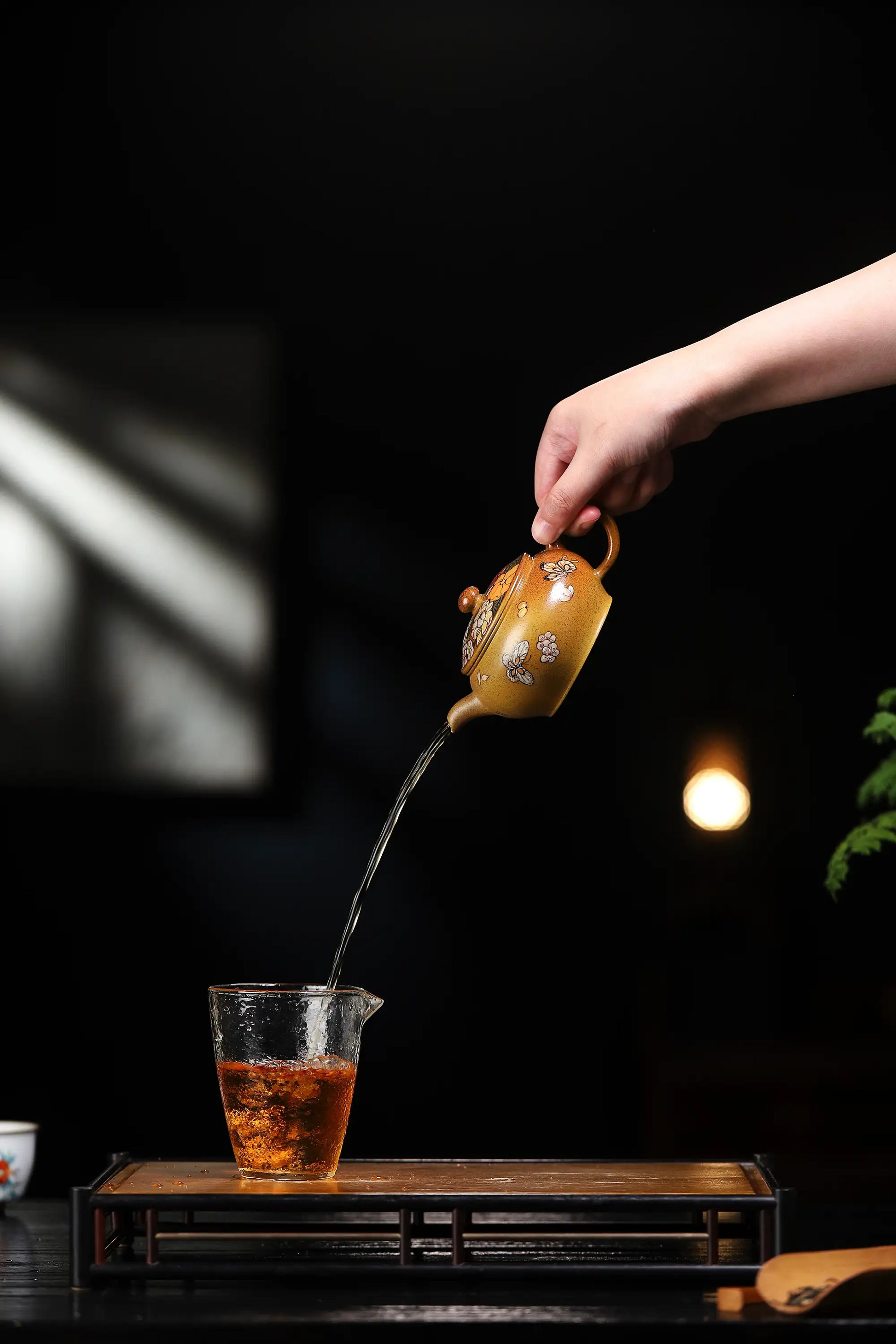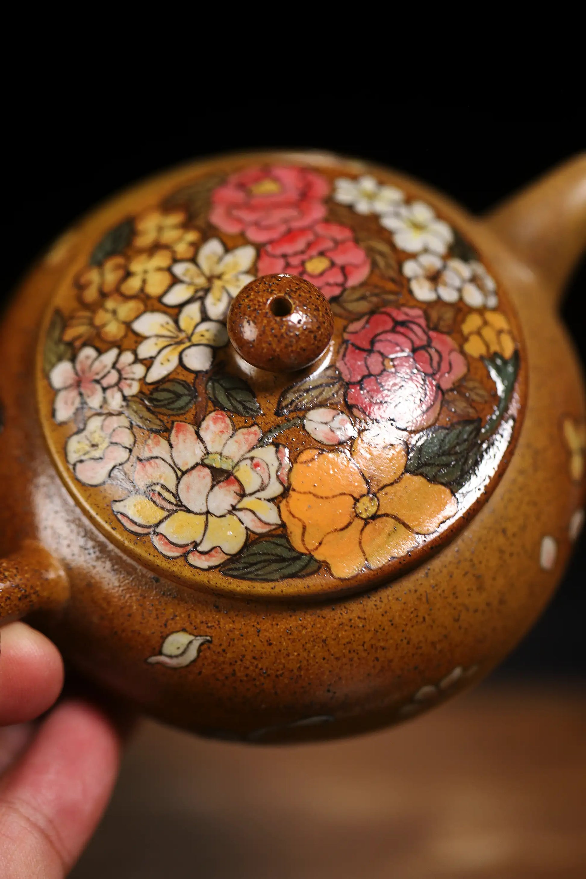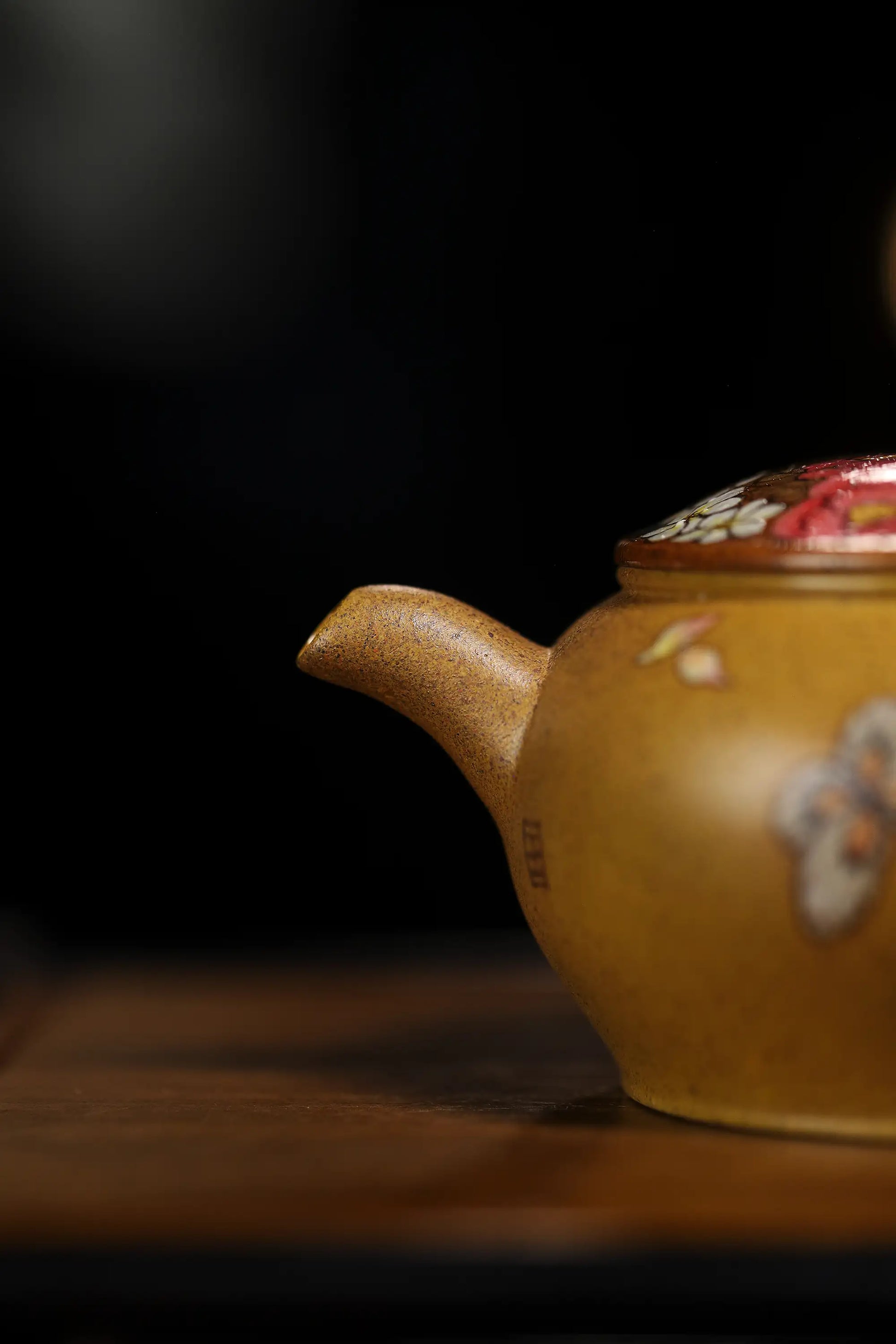 Crafted from rare Yixing Golden Duan Clay, this teapot is entirely handmade. The clay exhibits a warm golden hue with exquisite jade-like texture. A master artisan has employed exquisite painting techniques to depict peonies and butterflies on the 200ml pot body, with vibrant colors and lifelike details.