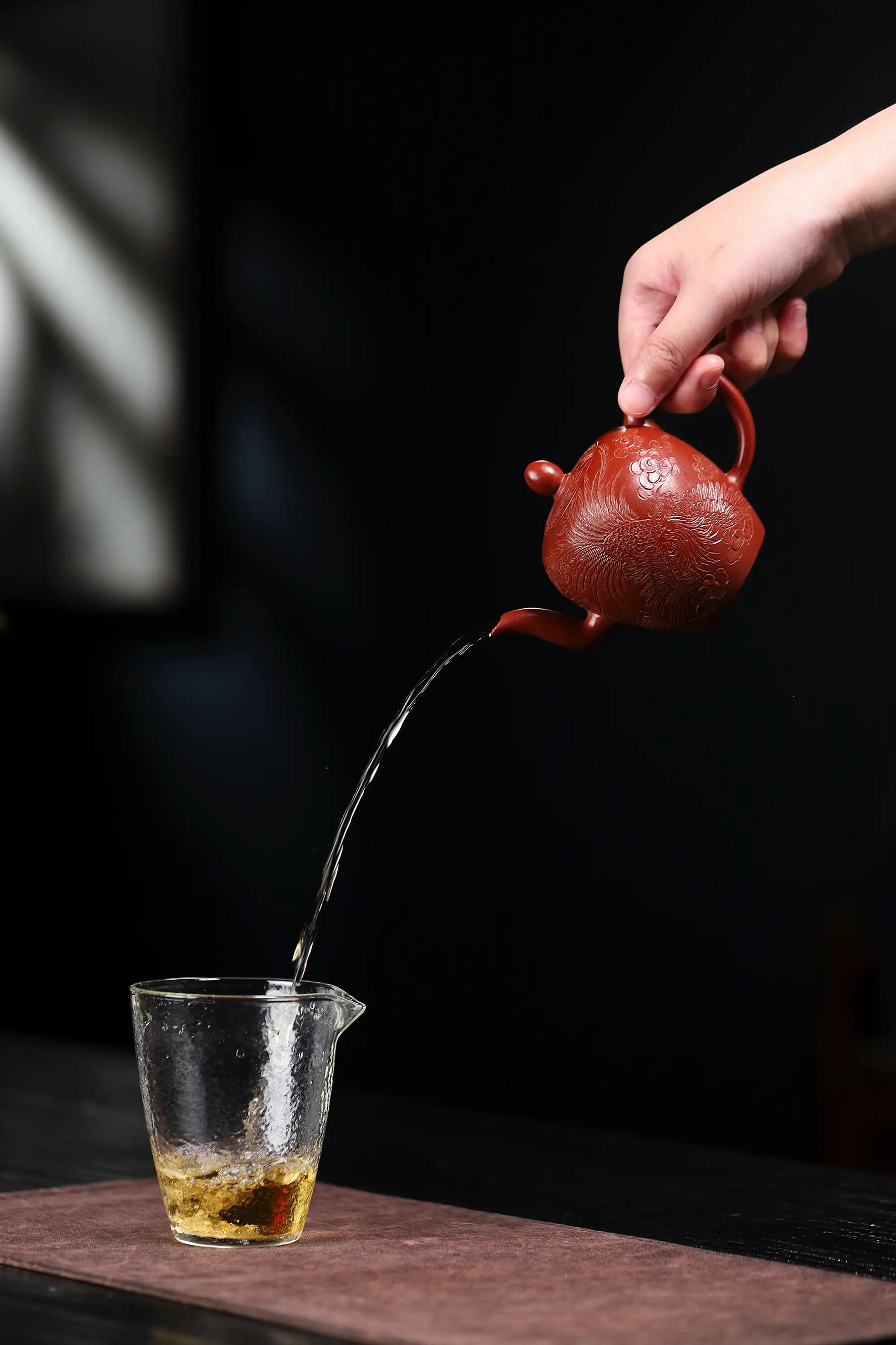Crafted from authentic Yixing Zhu Ni (Vermilion Clay), this teapot is entirely handmade. The clay is fine and smooth, exhibiting a pure reddish hue. A master artisan has employed exquisite carving techniques to engrave phoenix patterns throughout the body, with detailed feathers and graceful lines, showcasing perfect integration of traditional craftsmanship and auspicious motifs.