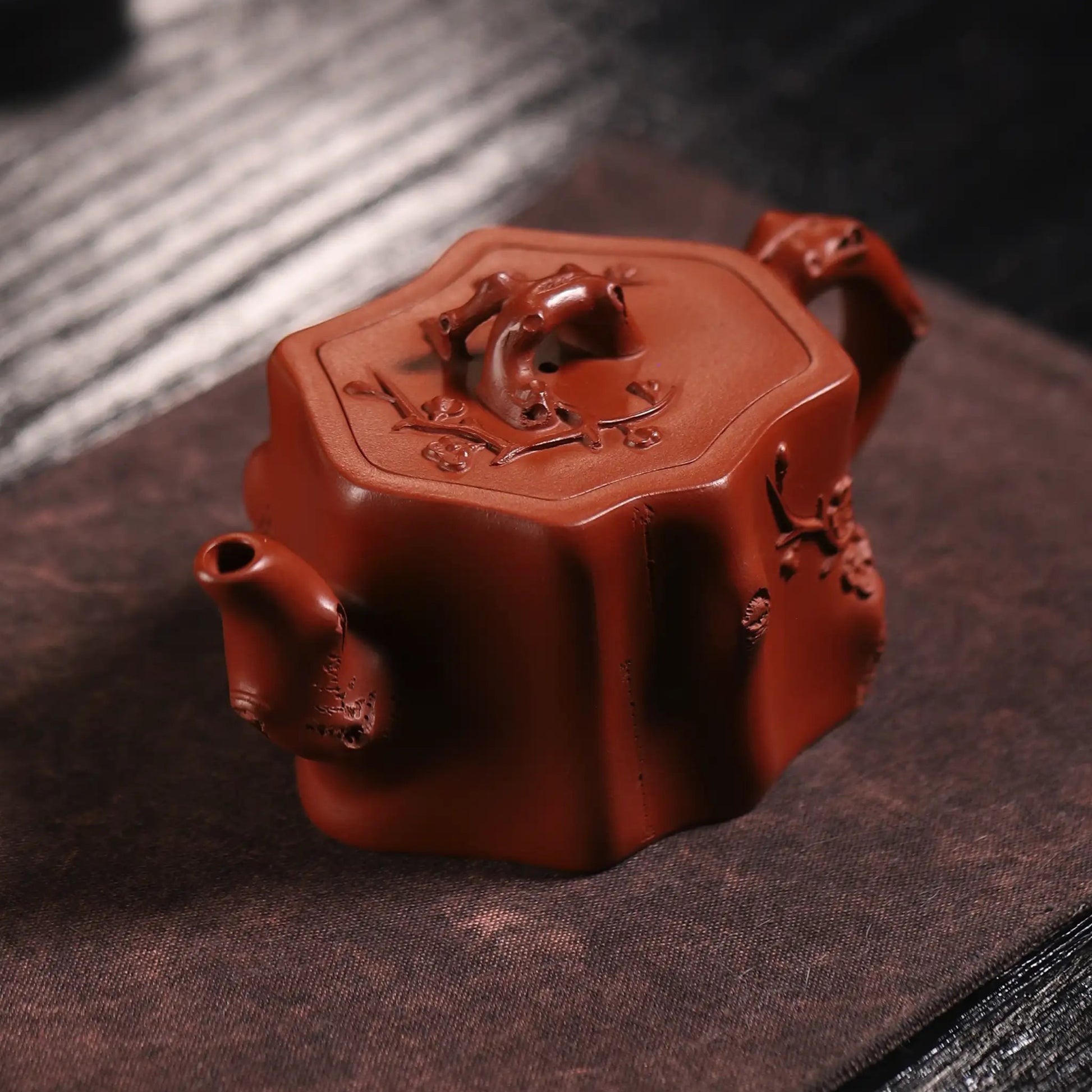 The teapot features the classic Mei Zhuang (plum stump) shape with a natural, organic form and graceful lines. The hexagonal body mimics a plum tree stump; bamboo-joint spout ensures powerful pouring, while plum-branch handle offers comfortable grip. The lid fits perfectly with excellent sealing, and the frog-shaped knob adds playful charm.