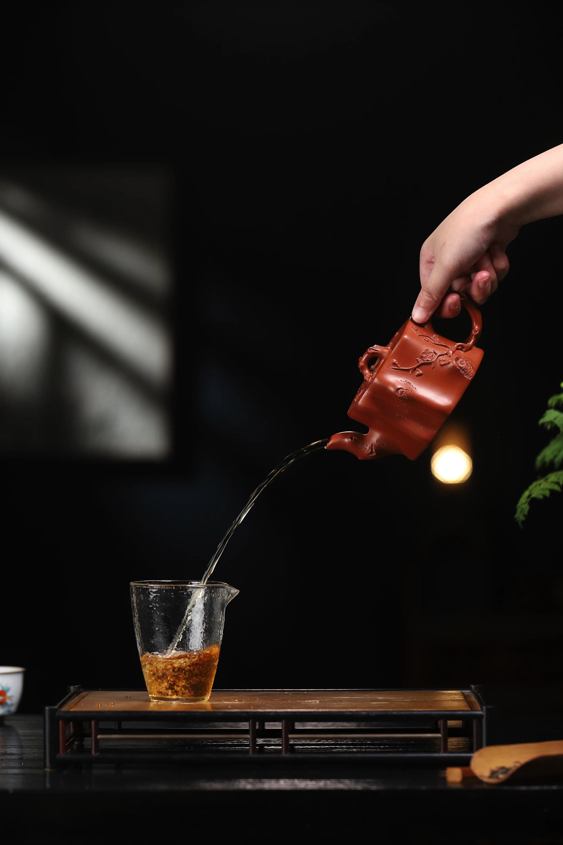 Crafted from rare Yixing Zhu Ni Clay, this teapot is entirely handmade. The clay exhibits a warm orange-red hue with exquisite jade-like texture. A master artisan has employed exquisite engraving techniques to depict plum blossoms on the 375ml pot body, with meticulous details and natural elegance.
