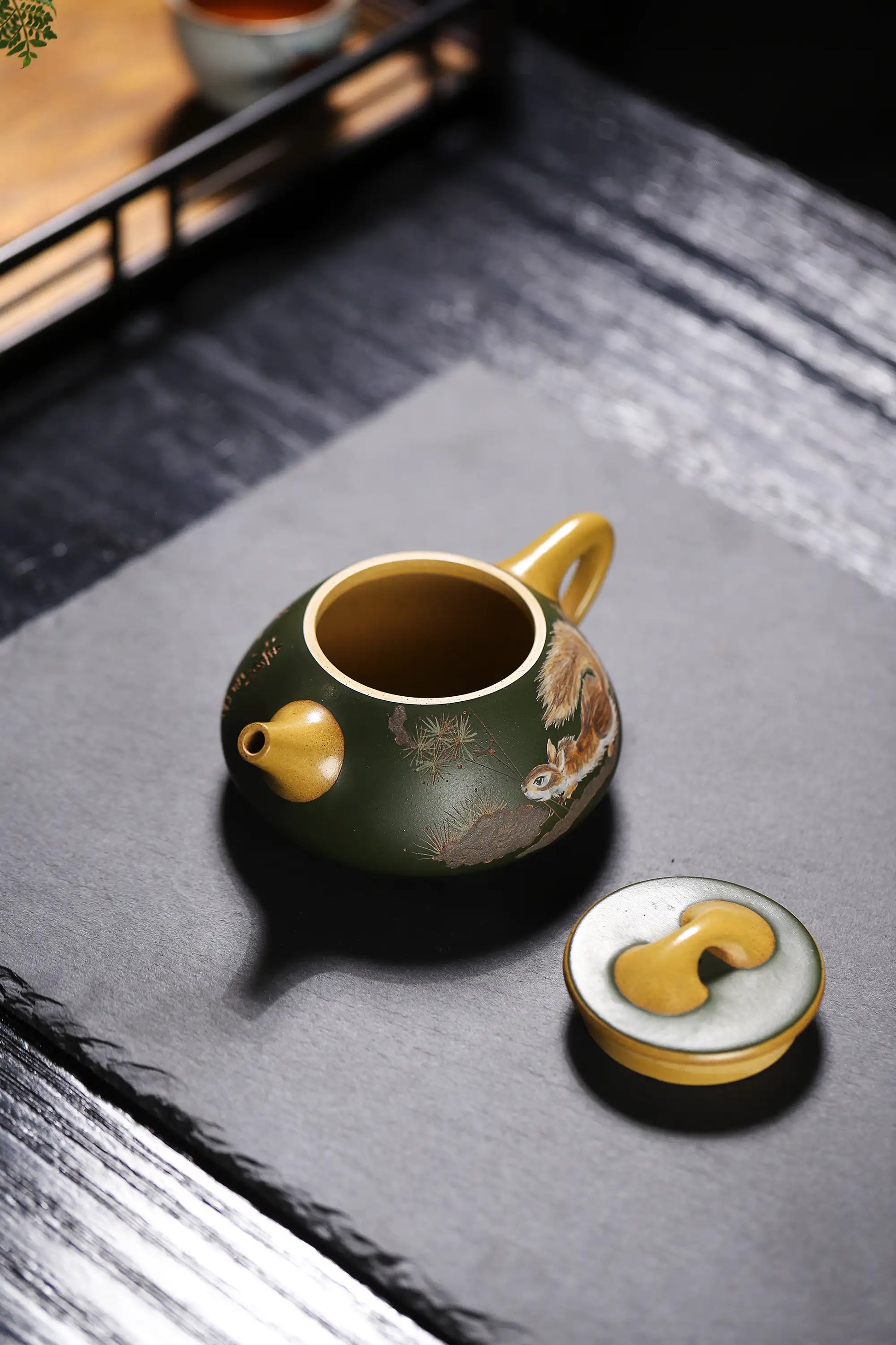 Crafted from authentic Yixing Duan Clay, this teapot is entirely handmade and finished with a powder-decoration technique. The clay exhibits a natural, rustic hue with exquisite texture. A master artisan has employed exquisite painting techniques to depict lively squirrels and carved the philosophical inscription "Qingxu Danbo, Gui Zhi Ziran" on the 275ml pot body.