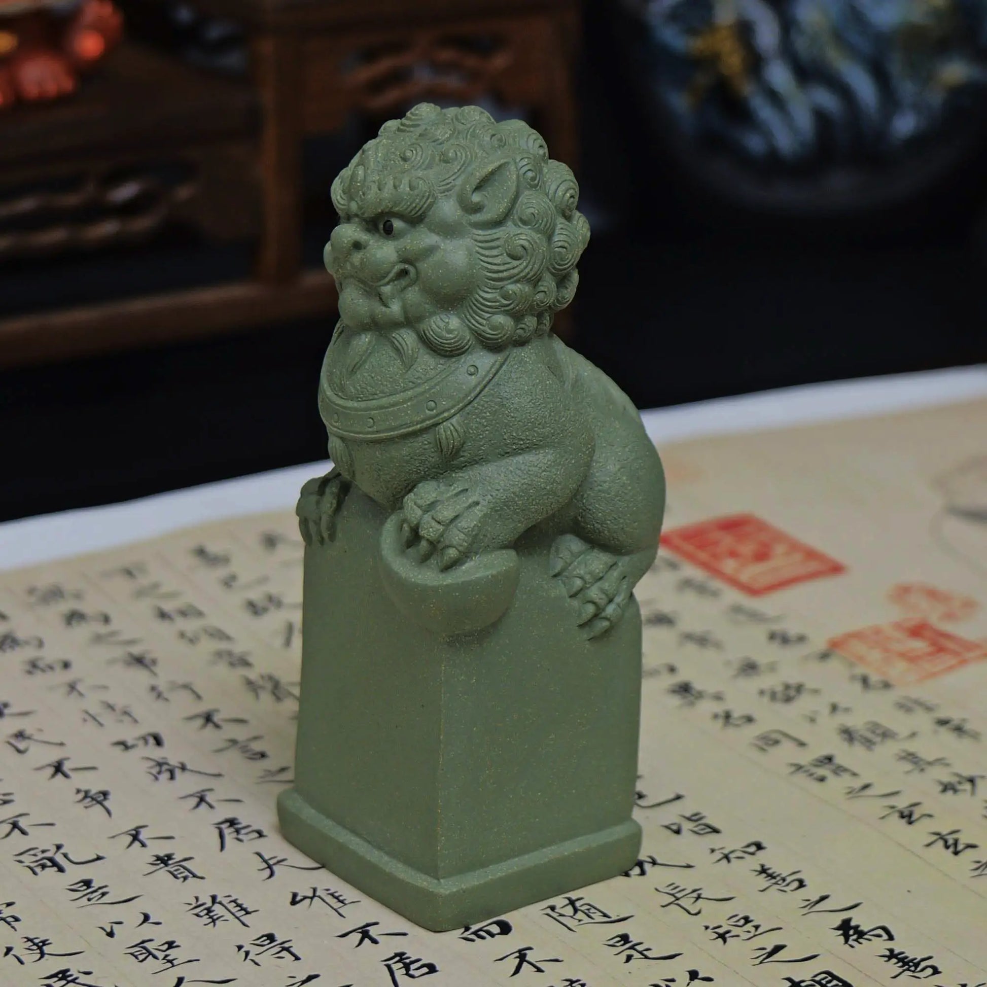Handcrafted from natural Yixing clay. The material is fine and smooth, fired using traditional kiln methods to achieve a fresh light green texture. Exquisite hand-carved details include the lion's spiral mane patterns, neck collar, bell decoration, and paw details, reflecting authentic Zisha artistry.