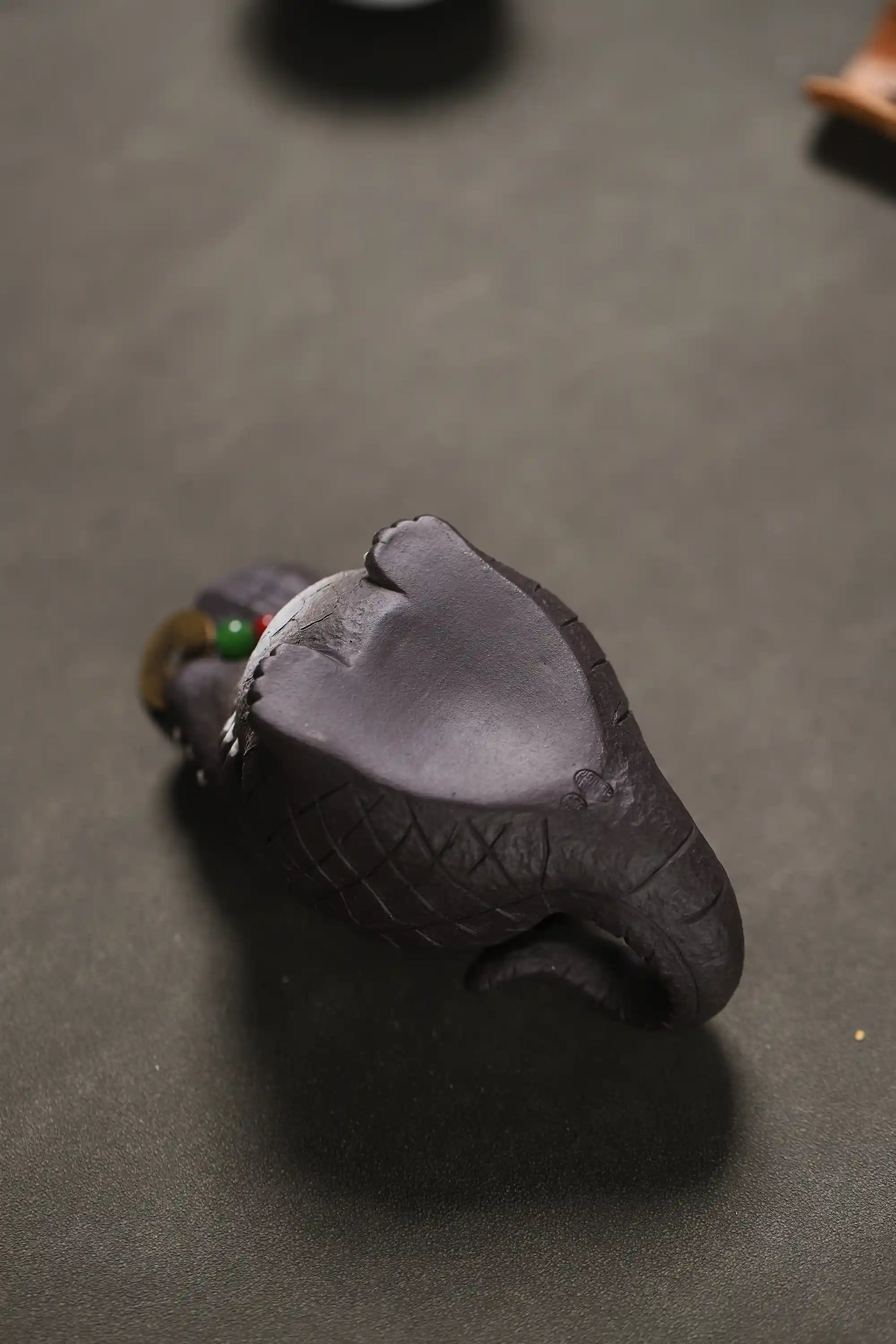 Handcrafted from natural Yixing Zisha clay, dimensions approximately 8cm (H) × 12cm (W) × 6cm (L). The material is fine and smooth, fired through traditional kiln methods to achieve a deep purple-brown hue. Exquisite hand-carved details include crocodile skin texture, emerald glass-bead eyes with golden pupils, red-green decorative beads, and ancient coin carvings on the back, showcasing authentic Zisha artistry blended with cultural creativity.