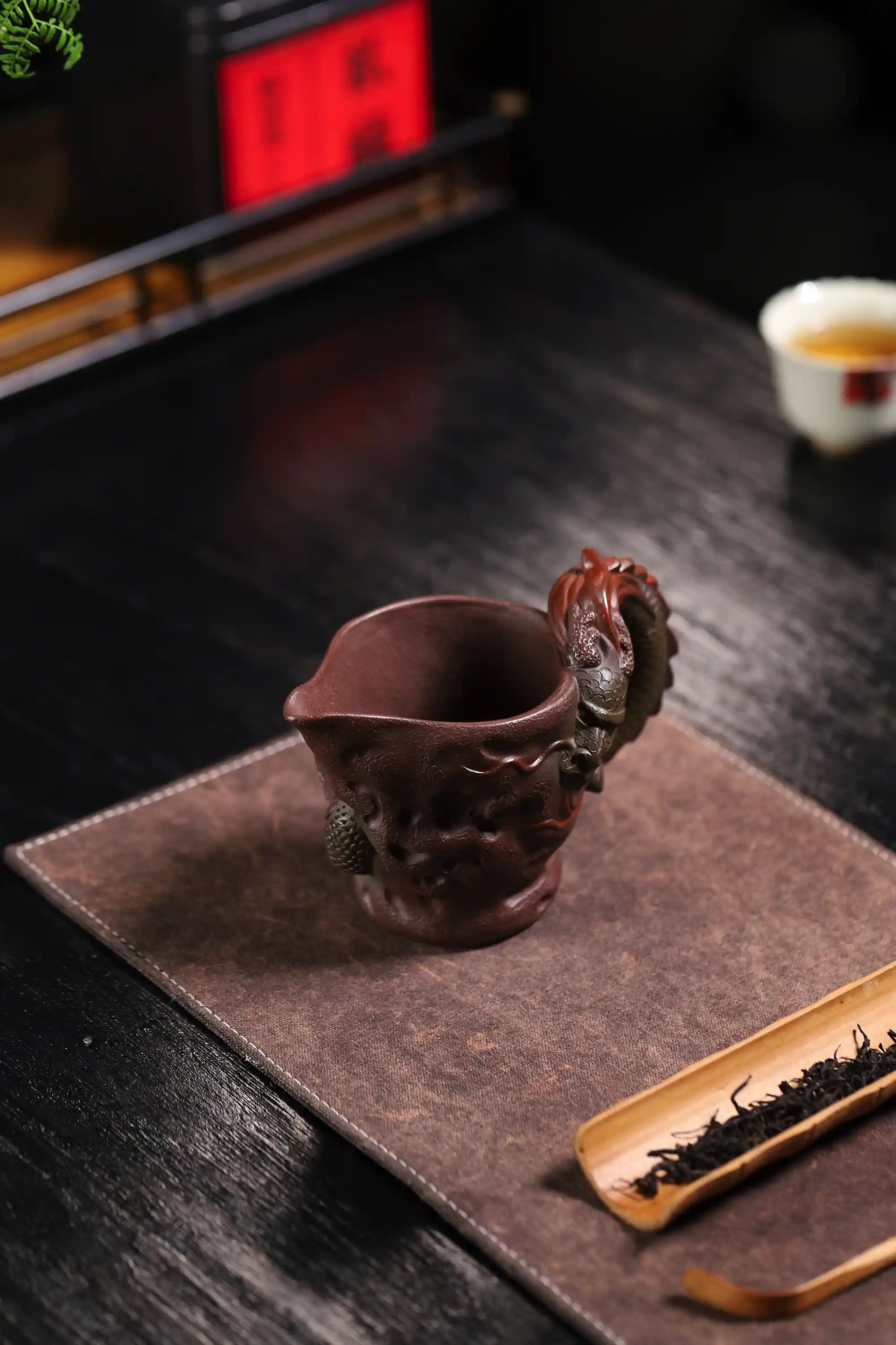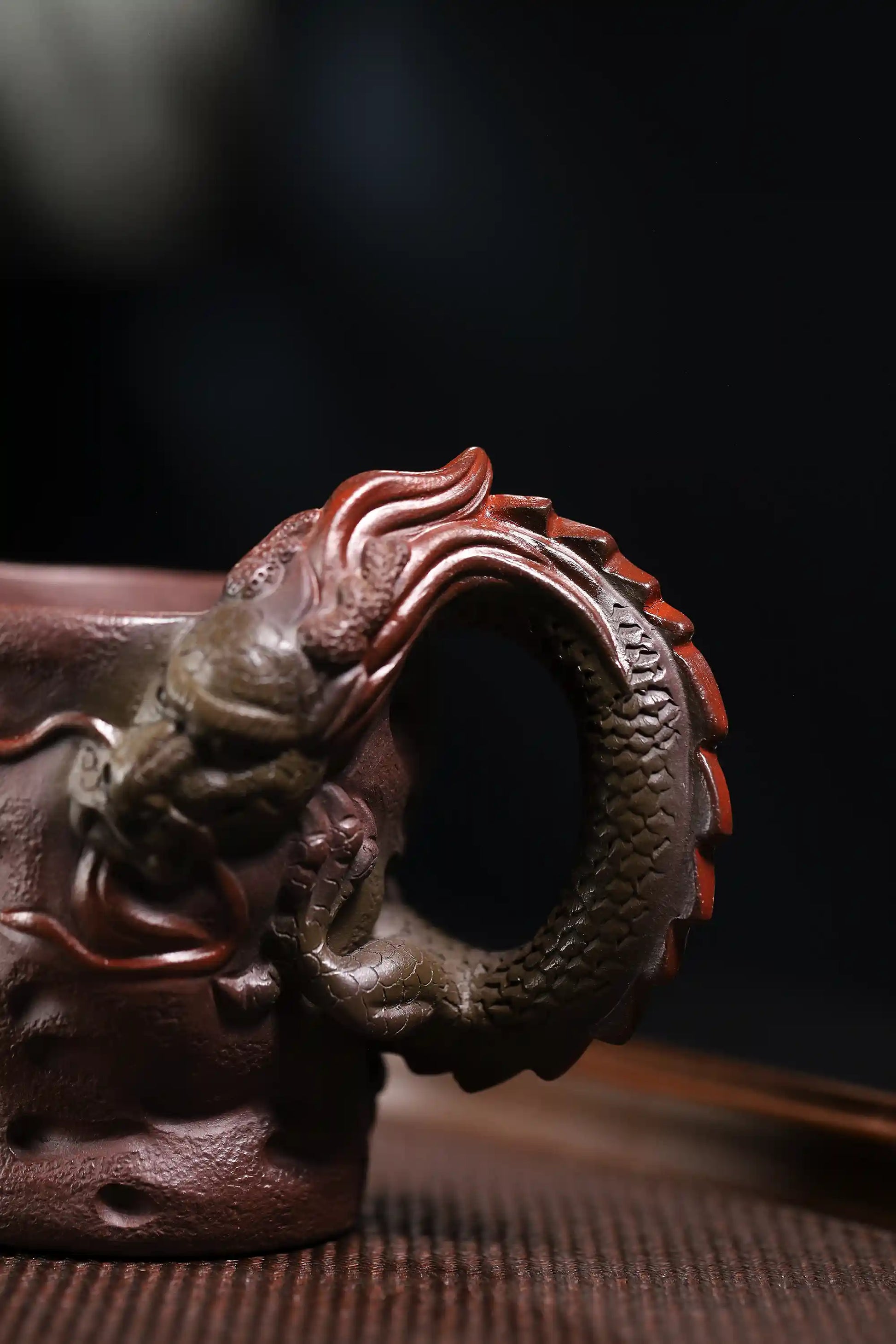 The porous Zisha clay maintains ideal tea temperature and develops an amber patina through tea nurturing, enhancing scale details. The dragon-head handle fits palm curves for secure, comfortable hold.
