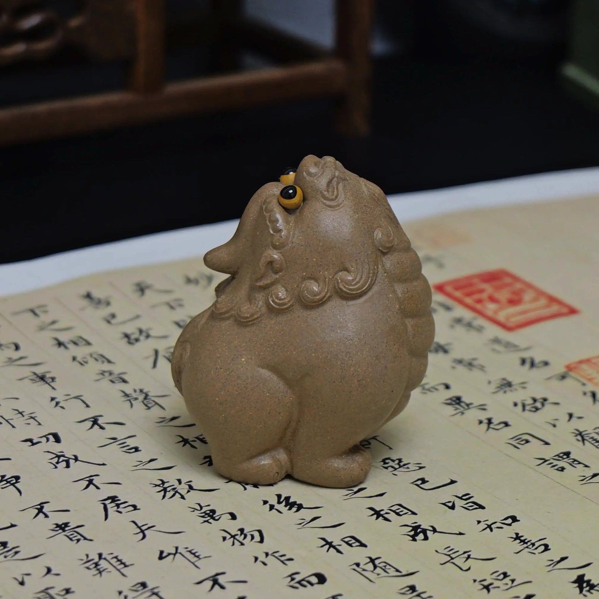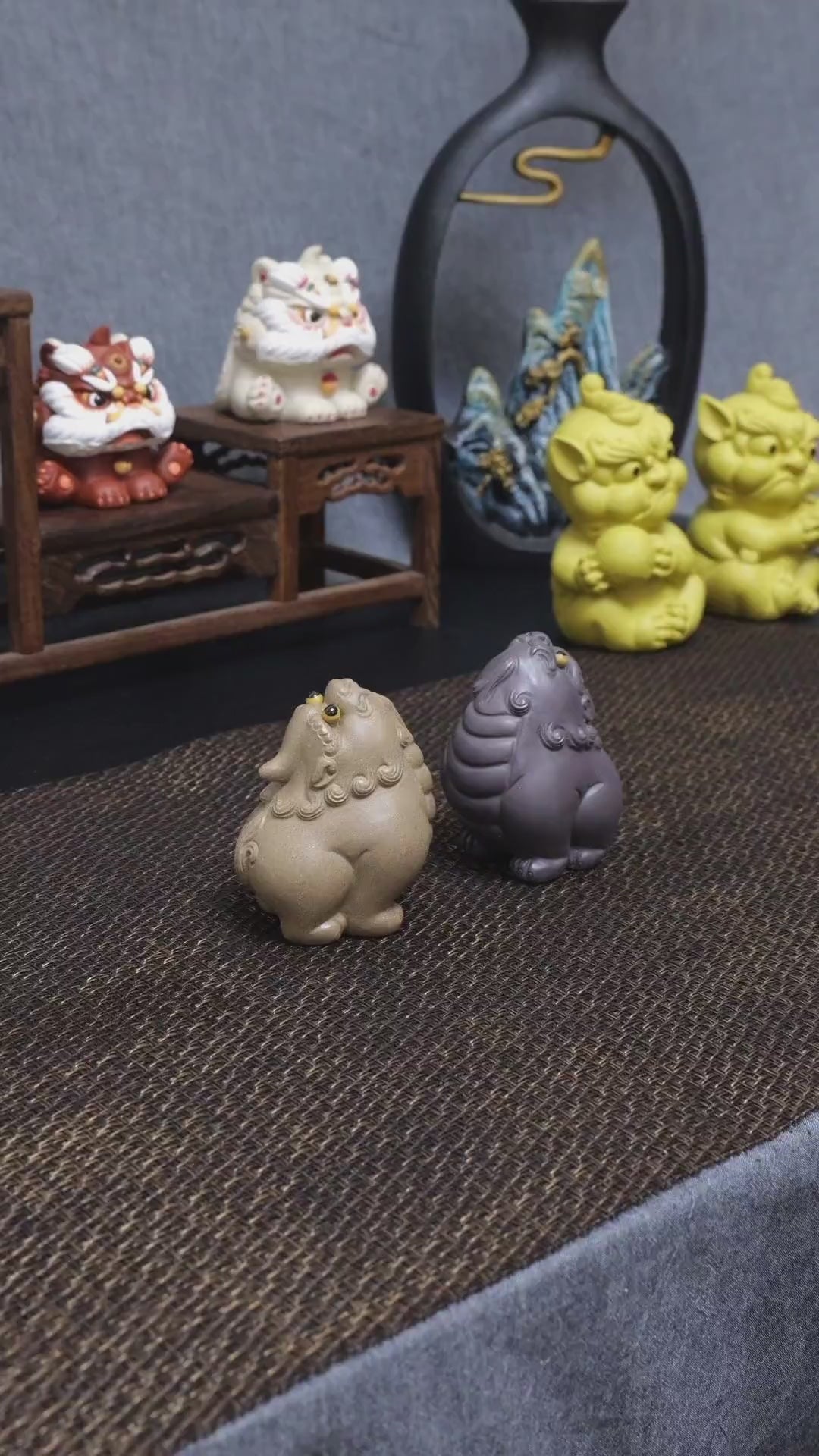 Handcrafted from natural Yixing Zisha clay. The material is fine and smooth, fired using traditional kiln methods to achieve an even gray texture. Exquisite hand-carved details include the lion's mane patterns, yellow eye accents, facial expressions, and body contours, reflecting authentic Zisha artistry.