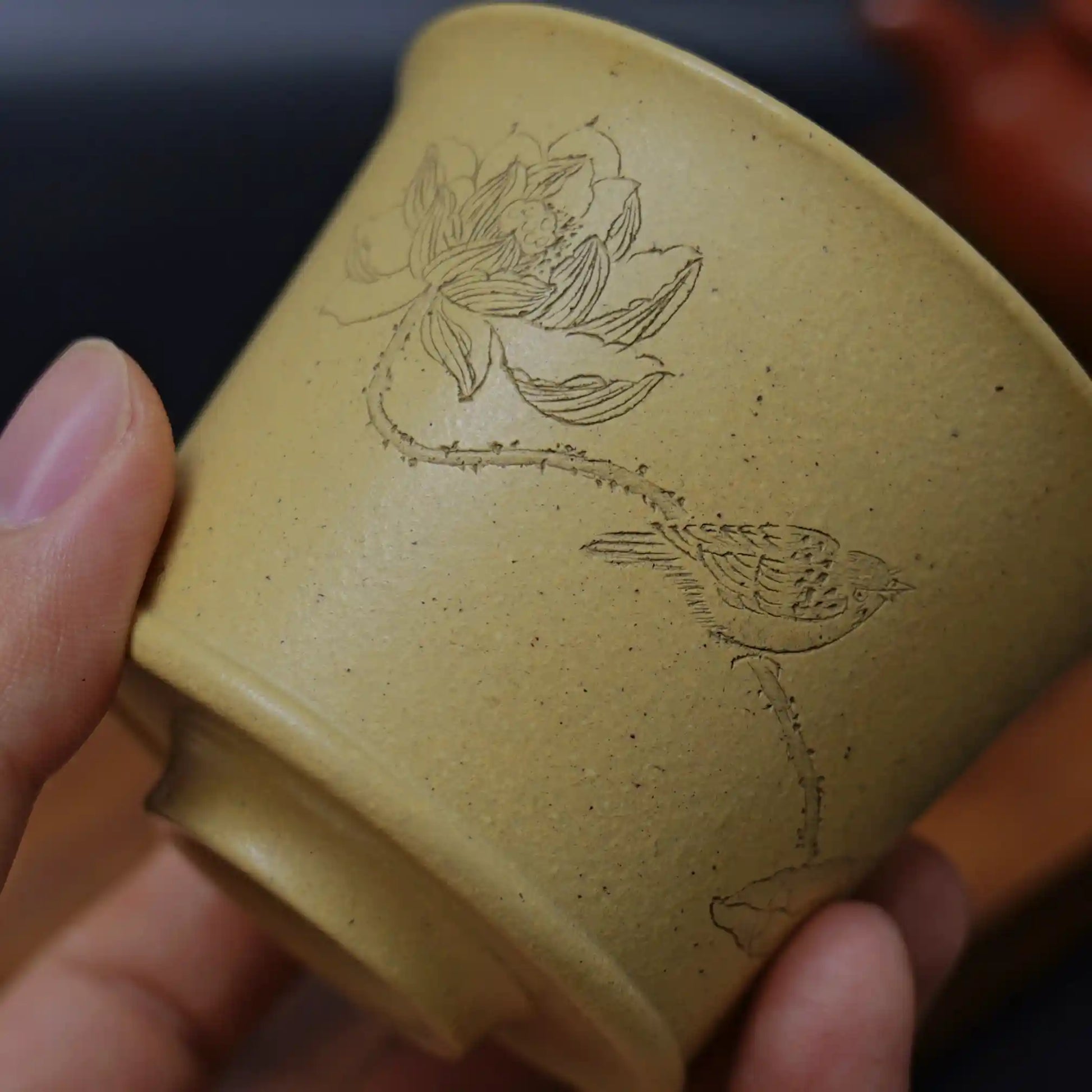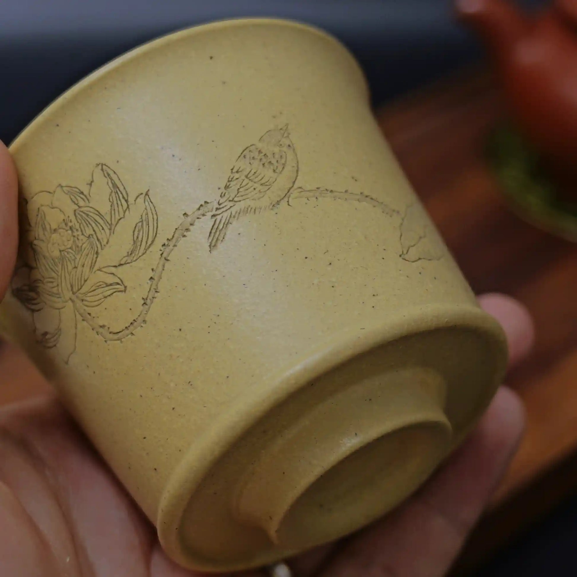 Handcrafted from natural Yixing Zisha clay, measuring approximately 8cm (H) × 7cm (caliber). The clay contains natural mineral particles, presenting a warm creamy beige texture, traditionally kiln-fired. Features exquisite hand-carved designs of a blooming lotus and a bird perched on a branch, with fluid lines showcasing classic Zisha engraving artistry.