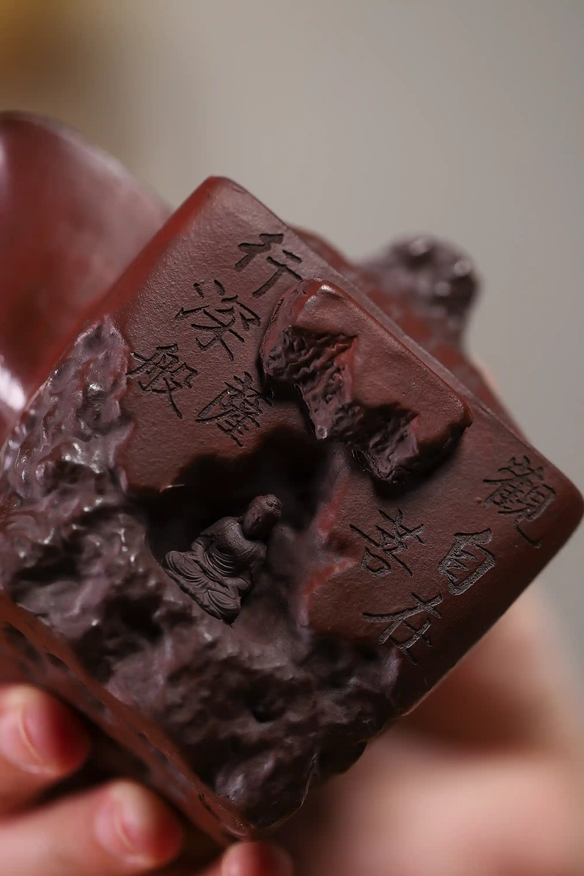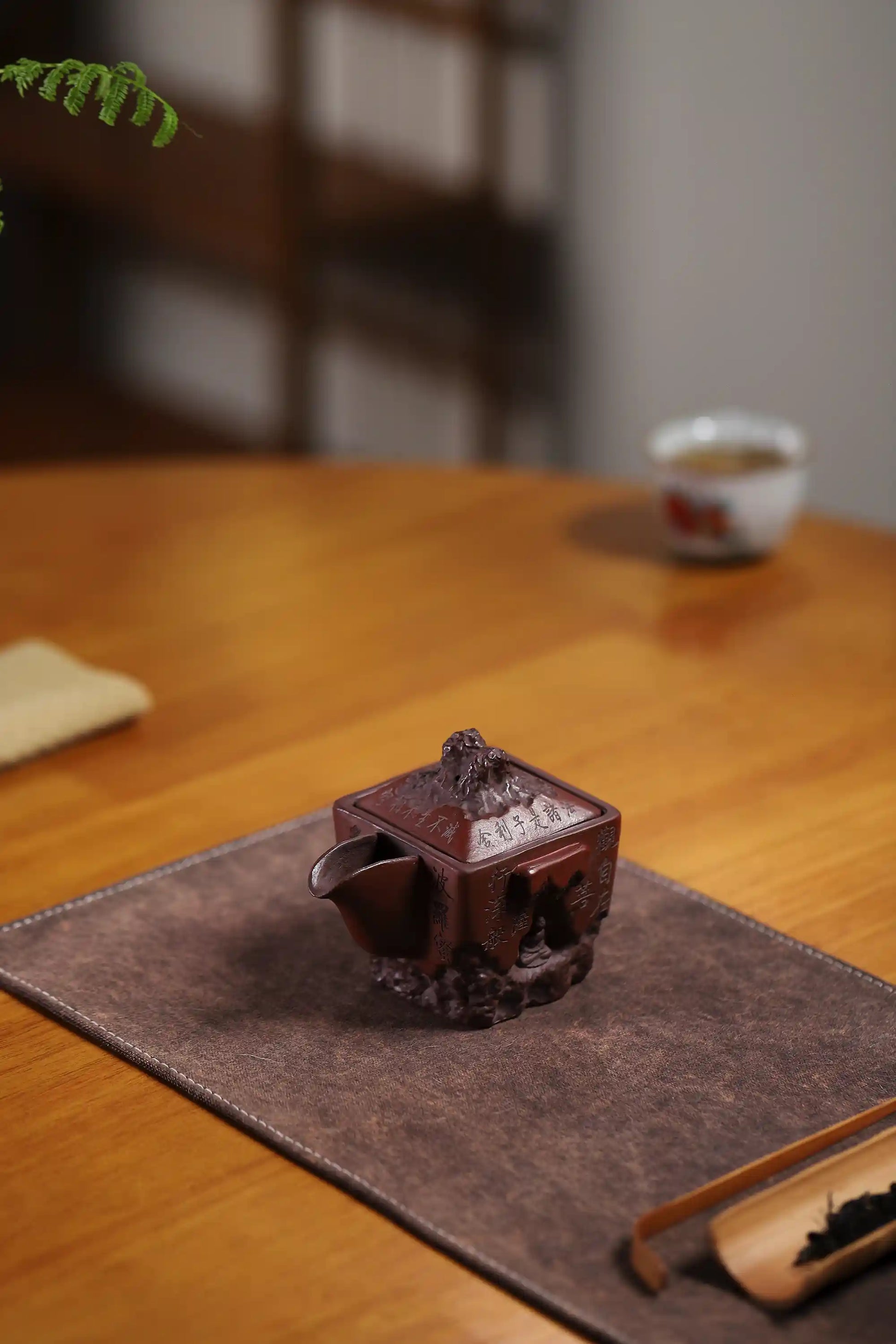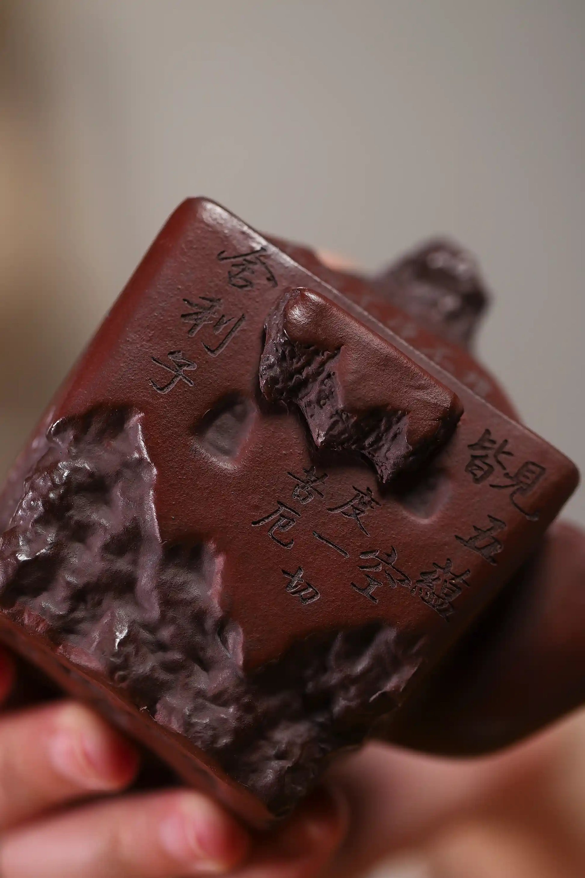 Inspired by Zen aesthetics, the teapot boasts a stable, square-shaped body with clean lines, symbolizing "a universe within a square inch." The lid knob is crafted into a mountain rock form, harmonizing with the relief artwork. The short spout ensures a smooth pour, and the handle offers a comfortable, secure grip. This design perfectly integrates calligraphy, scripture, sculpture, and Zisha craftsmanship, radiating a serene Zen atmosphere.