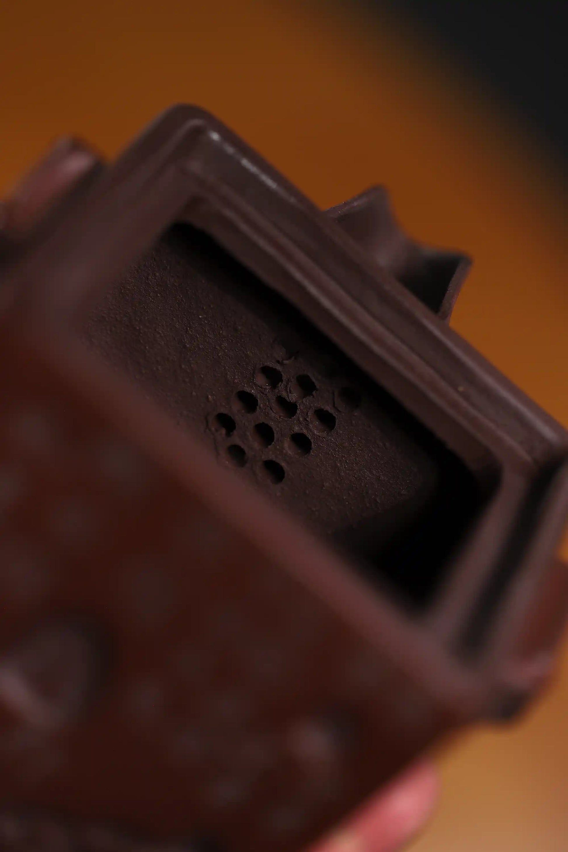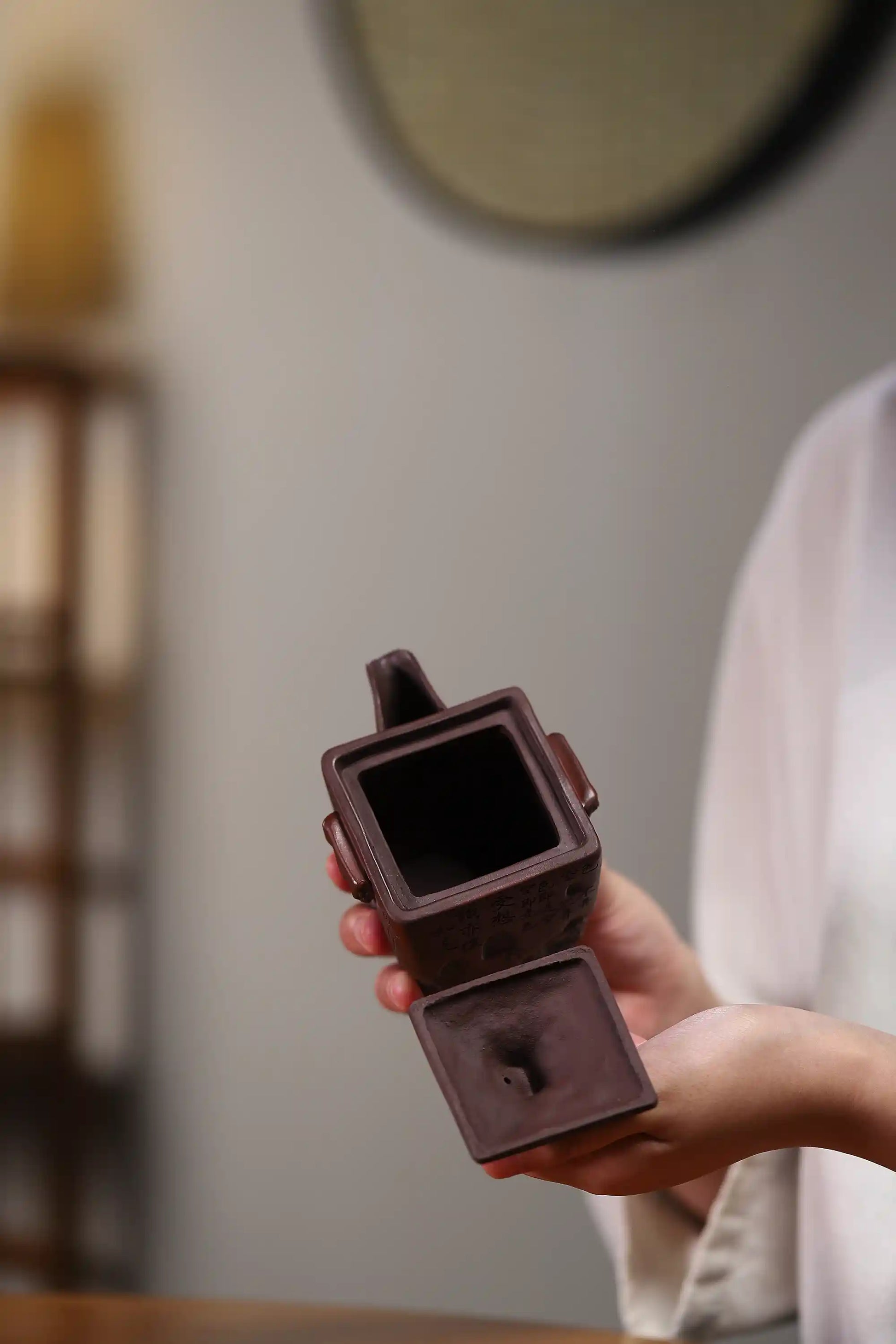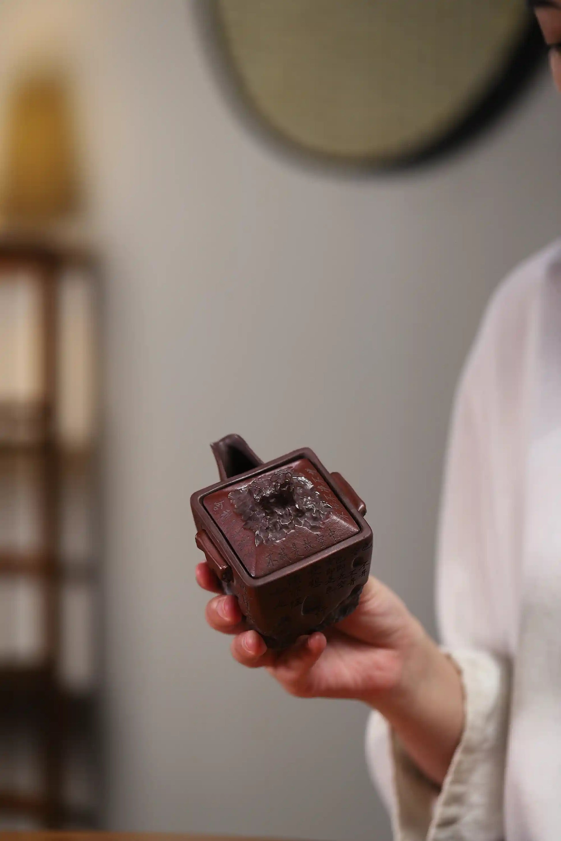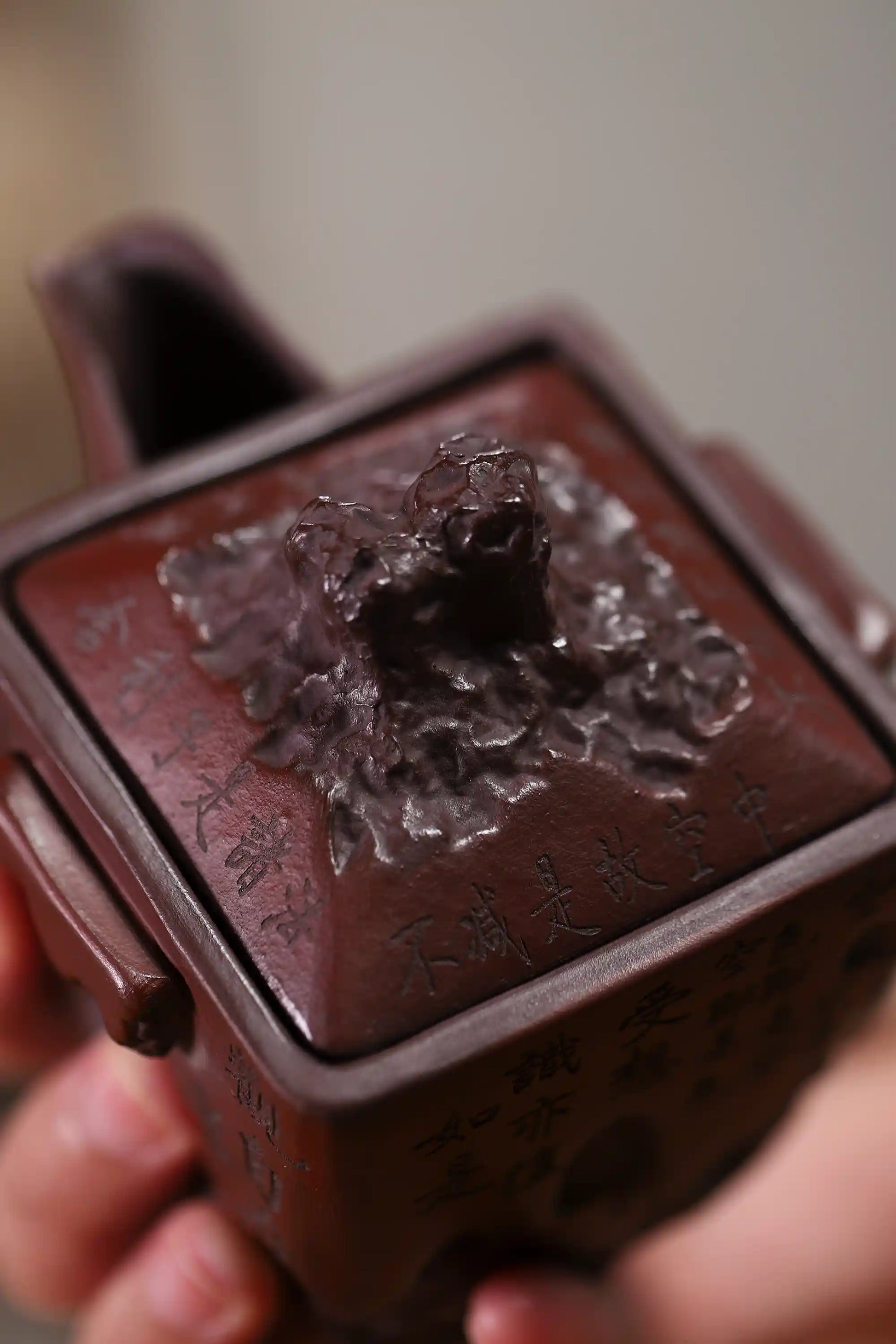 Inspired by Zen aesthetics, the teapot boasts a stable, square-shaped body with clean lines, symbolizing "a universe within a square inch." The lid knob is crafted into a mountain rock form, harmonizing with the relief artwork. The short spout ensures a smooth pour, and the handle offers a comfortable, secure grip. This design perfectly integrates calligraphy, scripture, sculpture, and Zisha craftsmanship, radiating a serene Zen atmosphere.