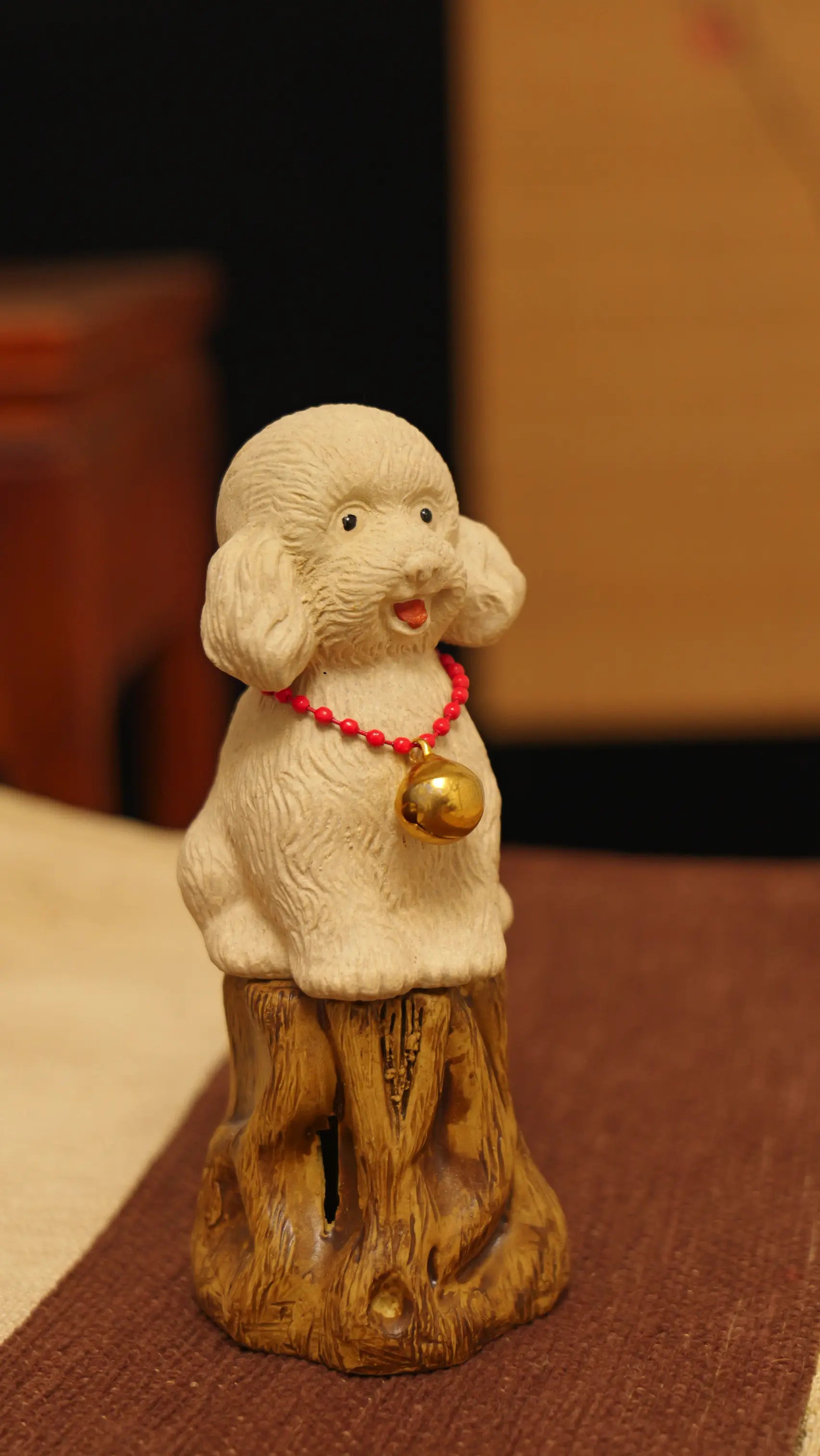 Handcrafted from natural Yixing Zisha clay, dimensions approximately 5cm (H) × 4cm (W) × 4cm (L). The material is fine and smooth, fired using traditional kiln methods to achieve an off-white texture. Exquisite hand-carved details include the puppy's fur texture, red hat details, bell decoration, and facial expression, showcasing authentic Zisha artistry.