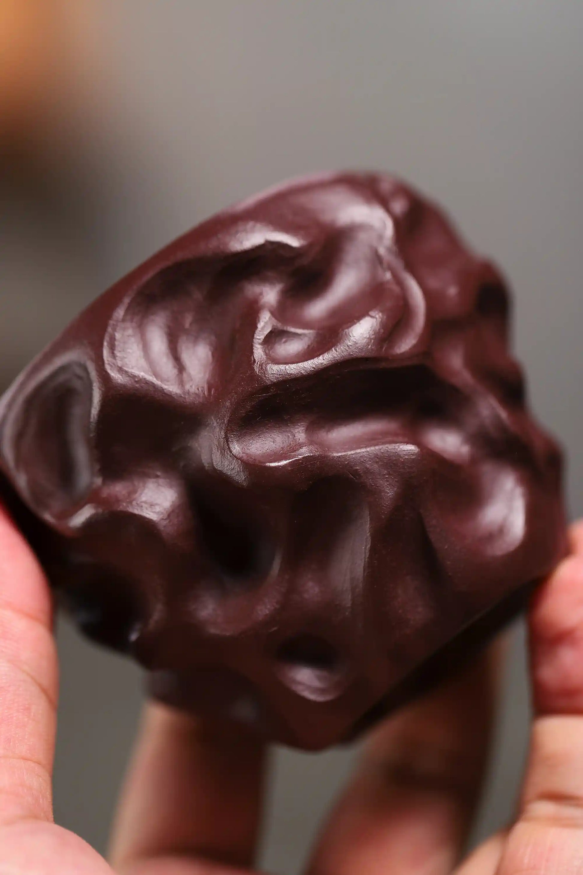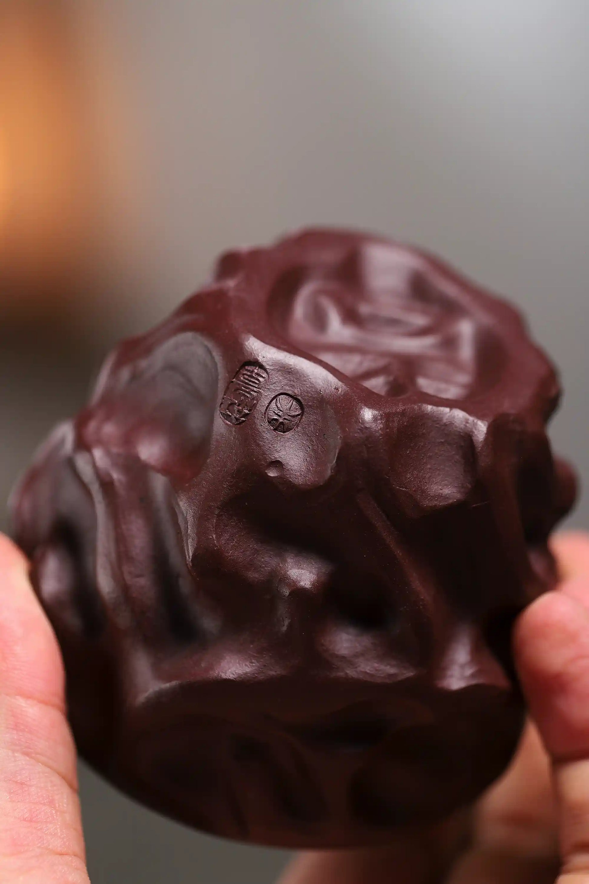 Hand-sculpted from natural Yixing Zisha clay, dimensions approximately 6.5cm (H) × 8cm (W). The surface meticulously replicates eroded rock textures with varying depths of grooves and pores, fired in traditional kilns to achieve a deep purple-brown hue. The porous structure enhances tea aroma retention while providing a tactile, earthy grip.