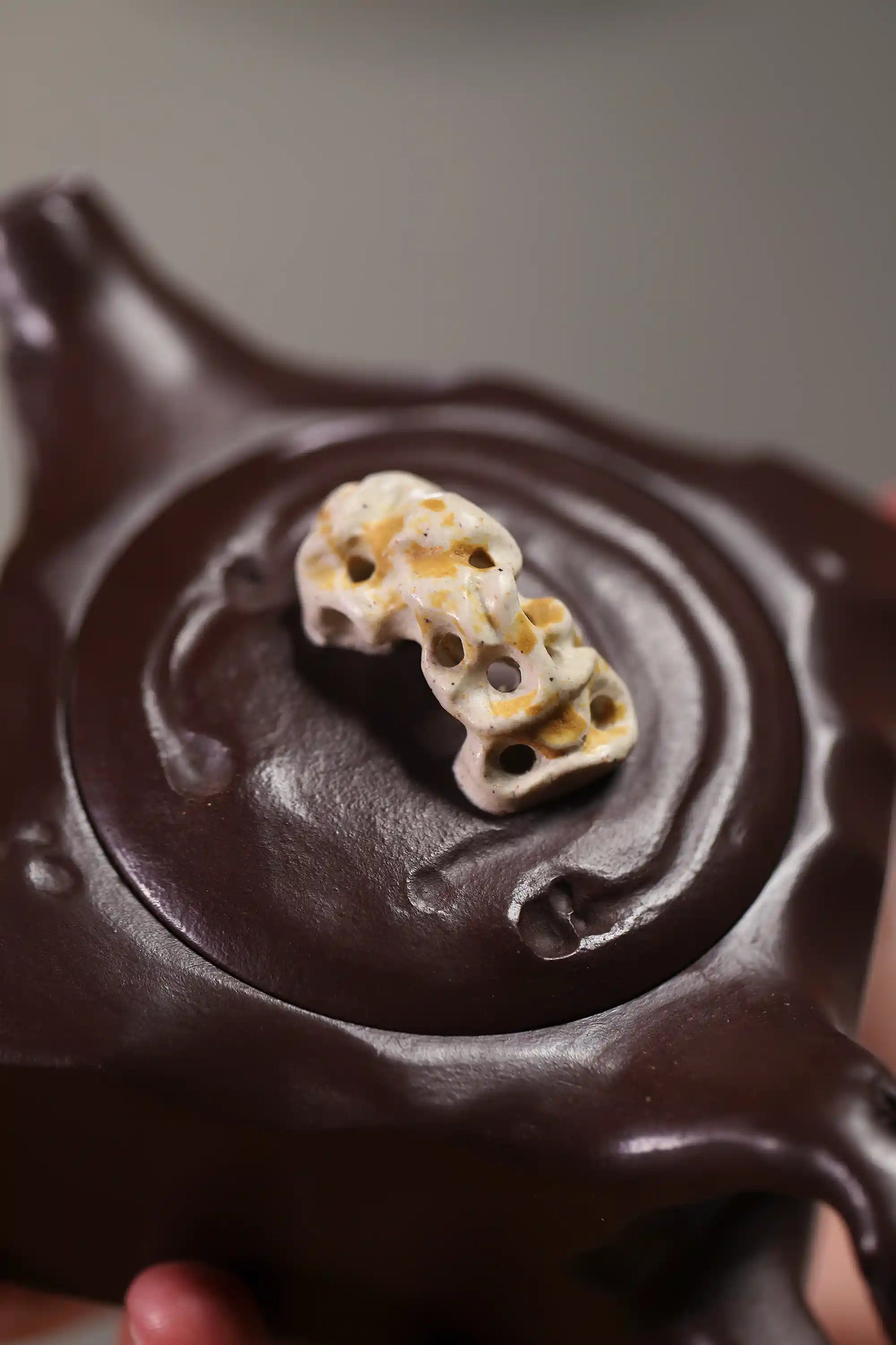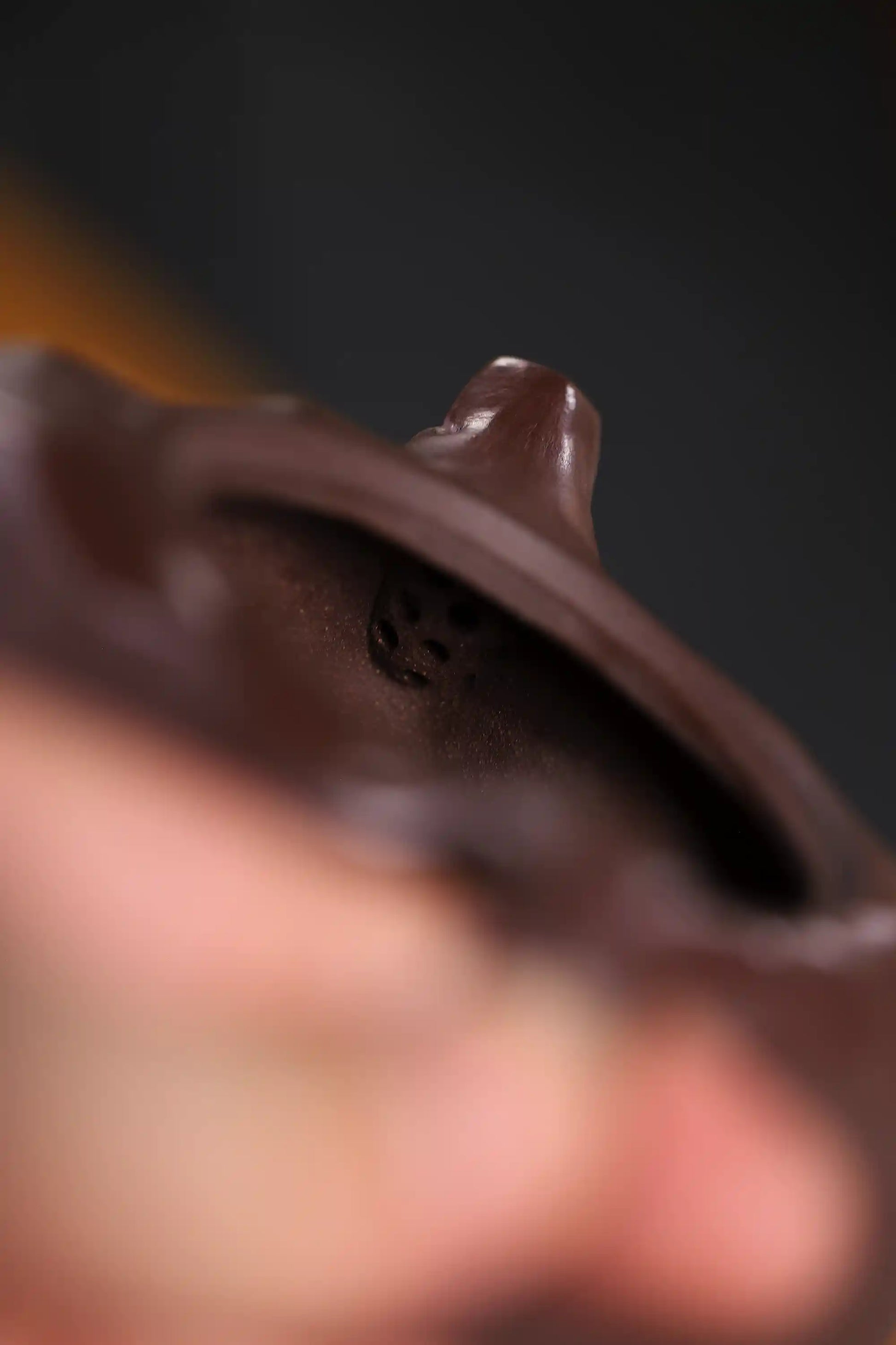Nurtured over time with tea liquor, the teapot develops a smooth, jade-like patina, enhancing the Zisha clay's character and making the mountain texture more pronounced and three-dimensional. Holding this teapot provides a delicate tactile experience, adding a sense of natural serenity and elegance to each tea session.
