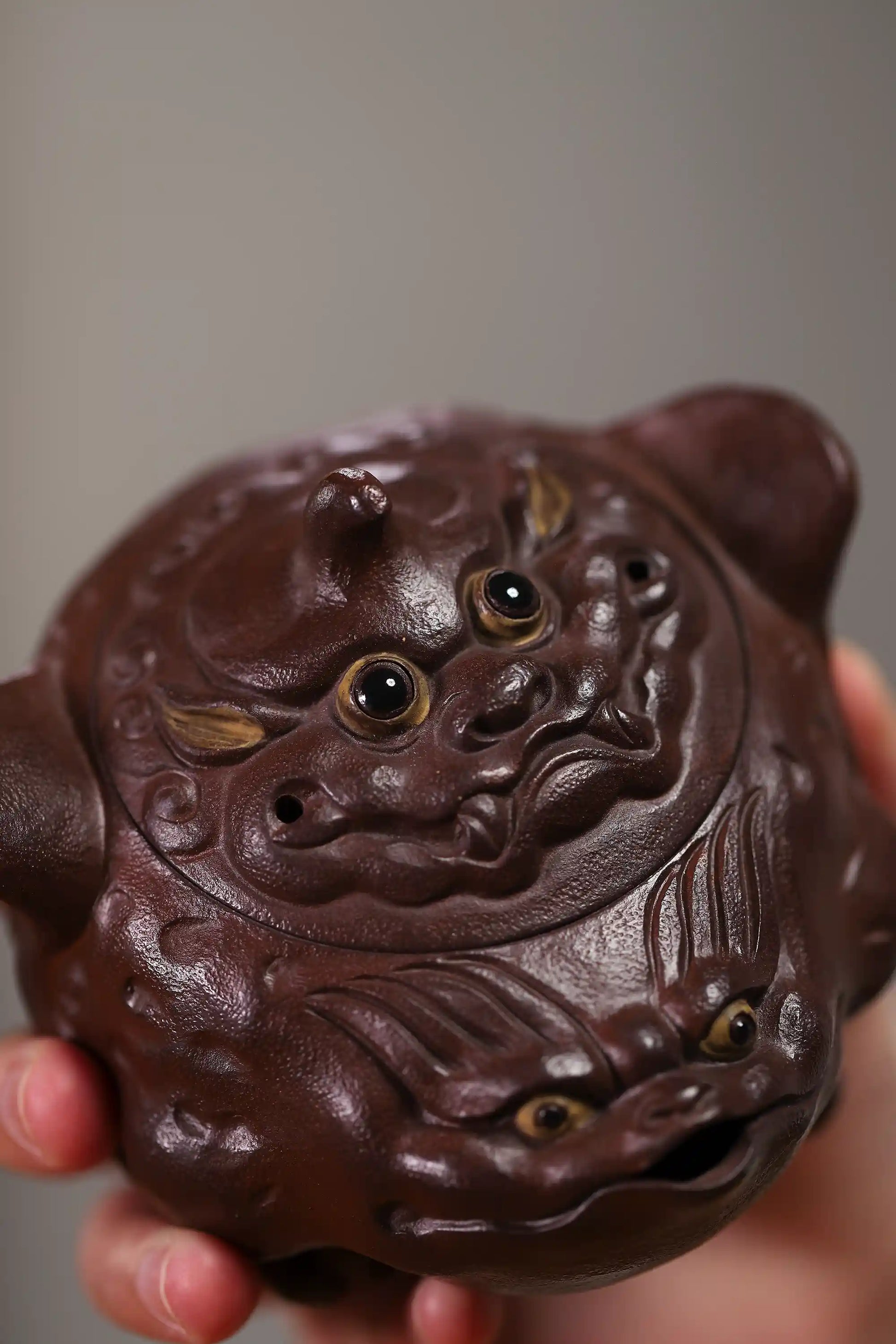 Meticulously handcrafted from natural Yixing Zisha clay, this teapot measures approximately 8cm (H) × 6cm (W) × 5cm (L). The clay is fine and smooth, fired in a traditional kiln to achieve a deep, elegant dark brown hue. The golden toad sculpture is lifelike, with skin textures and wide-eyed details meticulously hand-carved, showcasing authentic Zisha artistry.