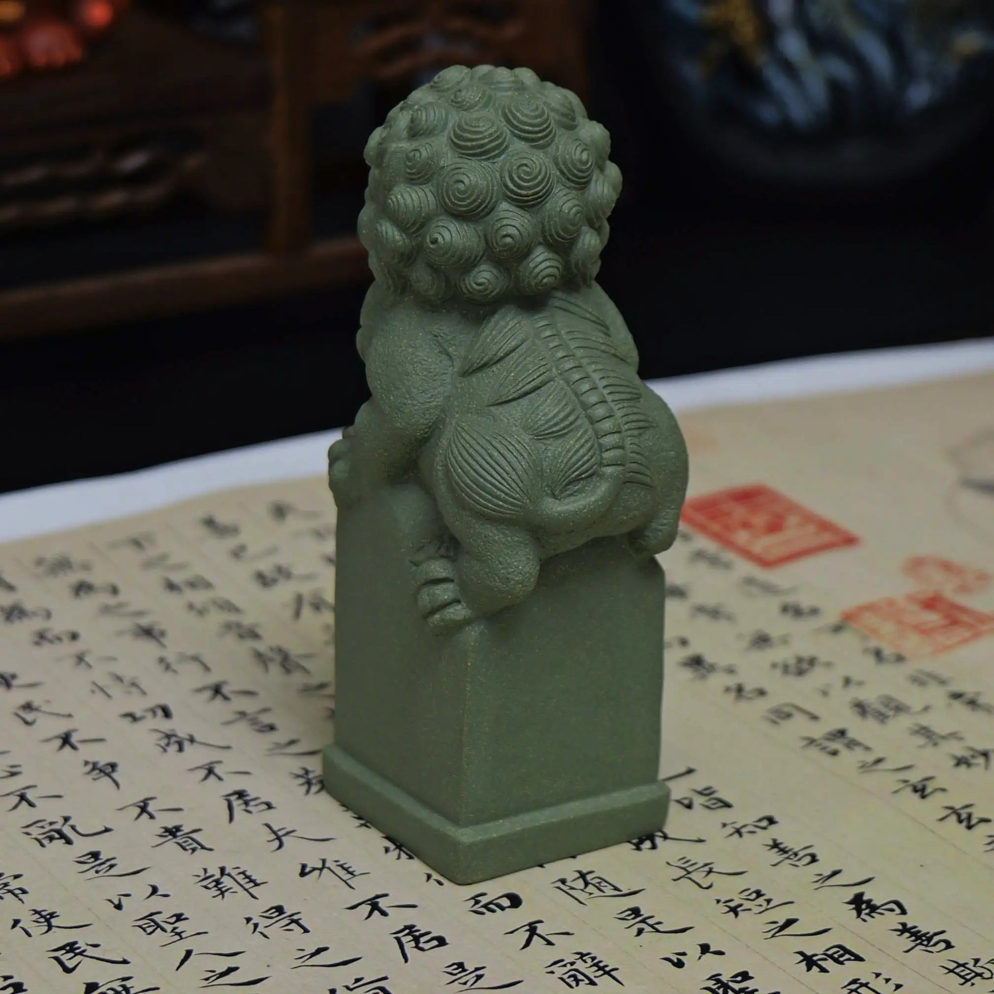 Handcrafted from natural Yixing Zisha clay. Unique light green glaze treated with special techniques, delivering a fine and smooth texture. Exquisite hand-carved details include the lion's mane patterns, facial expressions, paw details, and embroidered ball patterns, showcasing the perfect blend of traditional Zisha artistry and modern aesthetics.